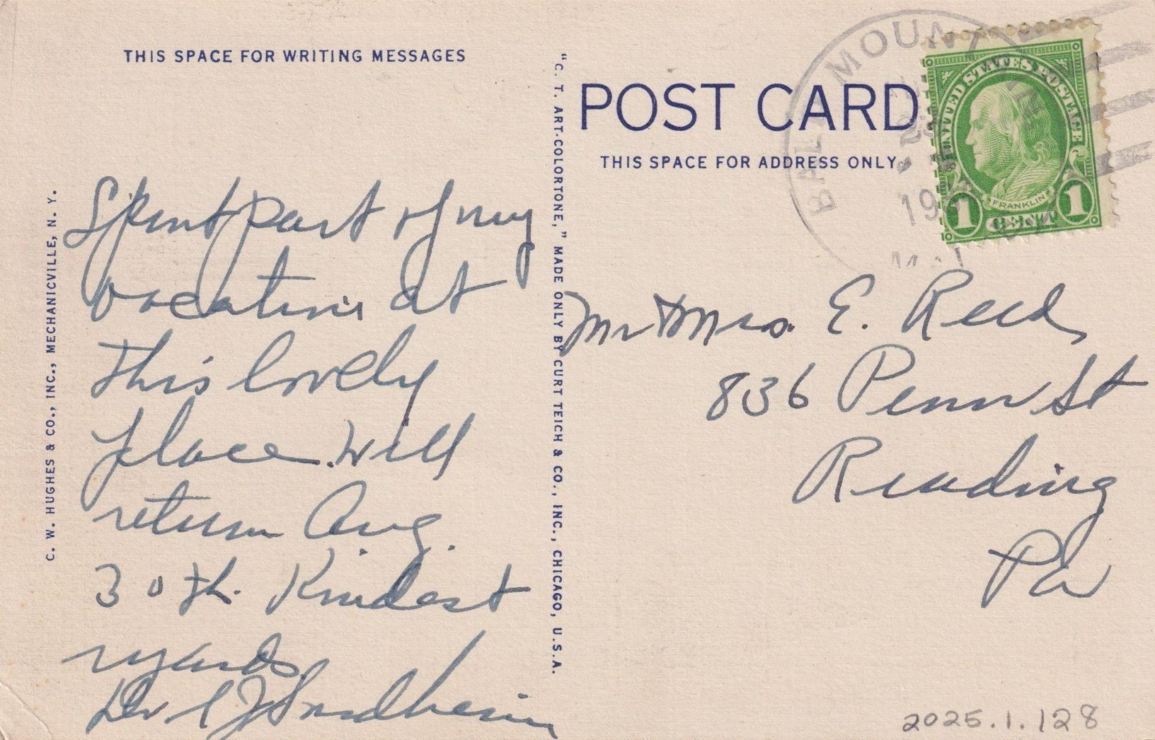 Handwritten message on reverse reads, "Spent part of my vacation at this lovely place. Will return Aug. 30th. Kindest Regards, Dr. [?]." Mailed to Mr. & Mrs. E. Reed, 836 Penn St., Reading, PA.Subject Place