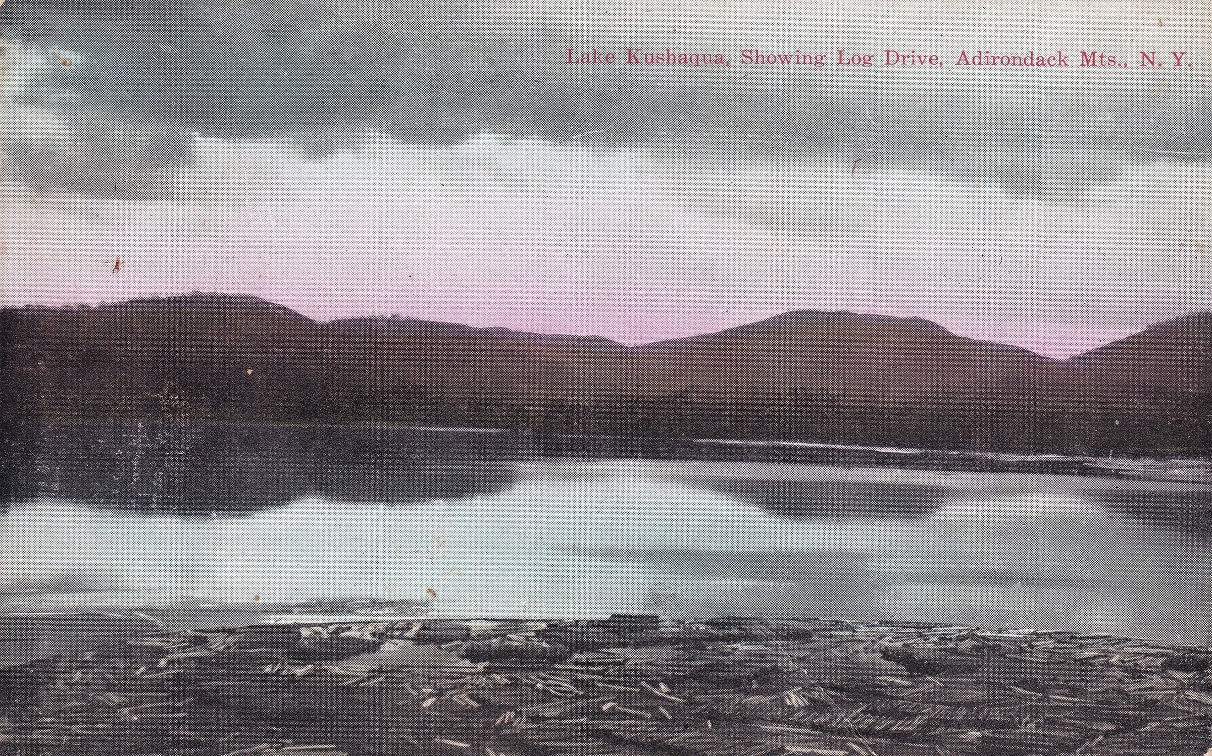 Color postcard showing logs floating in a lake, with mountains surrounding. Printed caption on front reads, "Lake Kushaqua, Showing Log Drive, Adirondack Mts., N. Y." Printed by Bradford & Co., St. Joseph, Mich. Used, divided back, postmarked Lake Kushaqua, NY, August 15, 1917 [?]. Handwritten message on back reads, "Oh! You Bump. This is some place. Wish you were here. Adelaide." Mailed to Miss E. Bartlett, Gloversville, NY, R.F.D. No. 1.Subject Place