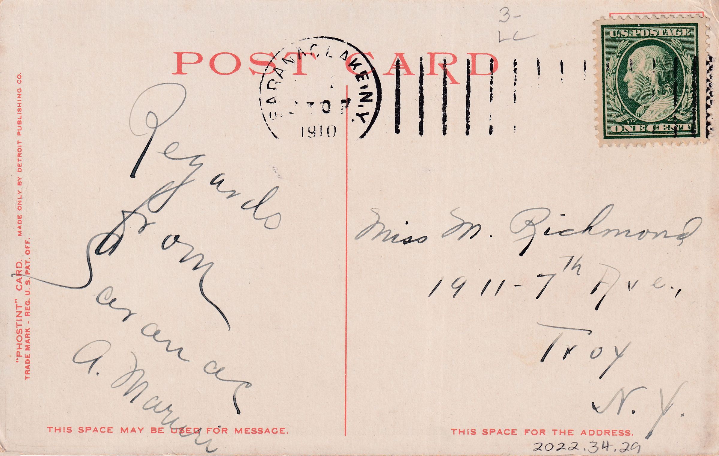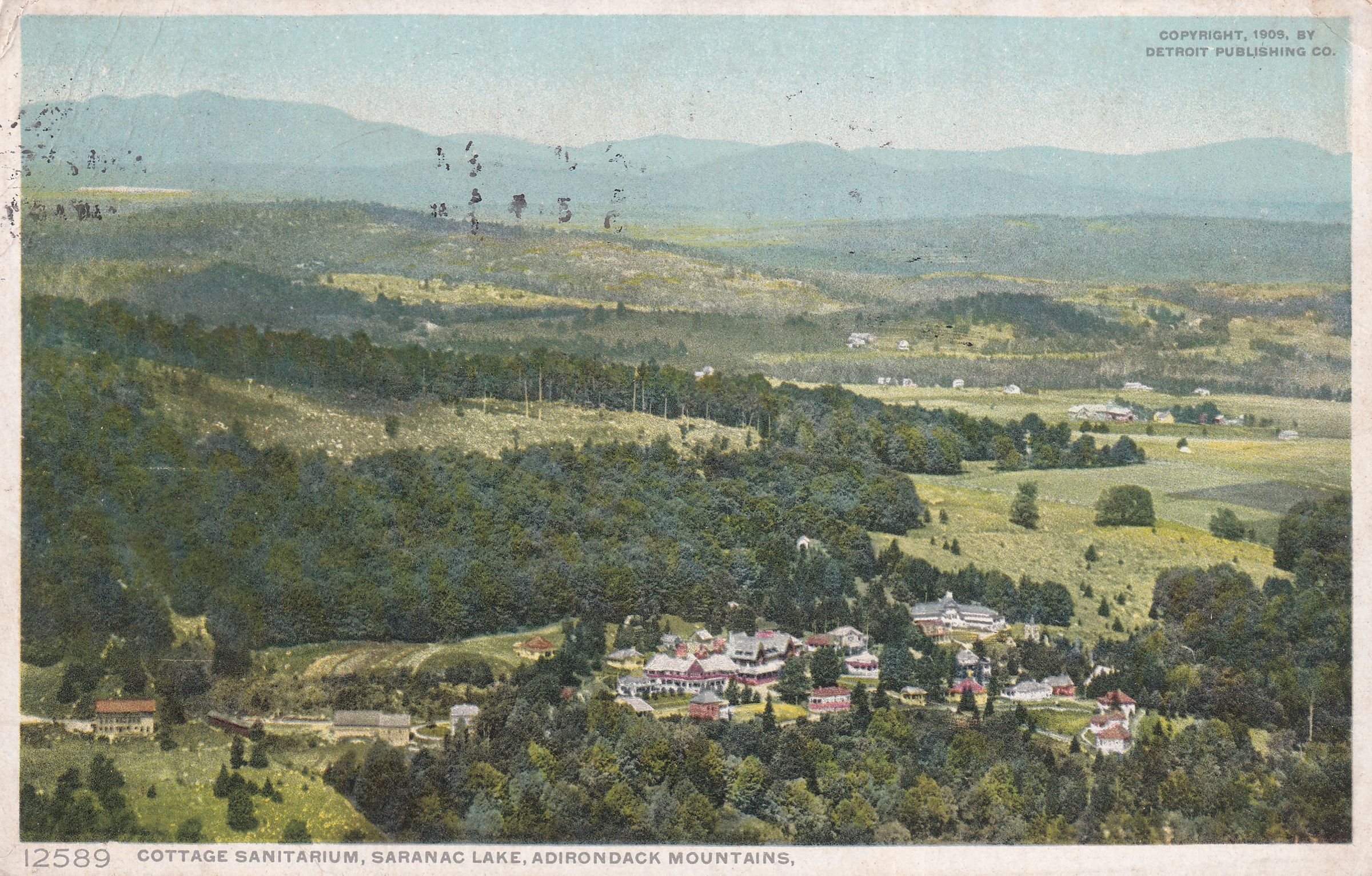 Color postcard showing an elevated view of the Adirondack Cottage Sanitarium (later renamed Trudeau Sanatorium), probably from Mt. Baker. Printed caption on front reads, "Cottage Sanitarium, Saranac Lake, Adirondack Mountains." "Photostint" card printed by Detroit Publishing Co. Used, divided back, white border, postmarked Saranac Lake, [?], 1910. Handwritten message on back reads, "Regards from Saranac, A. Marvin [?]." Mailed to Miss M. Richmond, 1911-7th Ave., Troy, NY.Subject Place