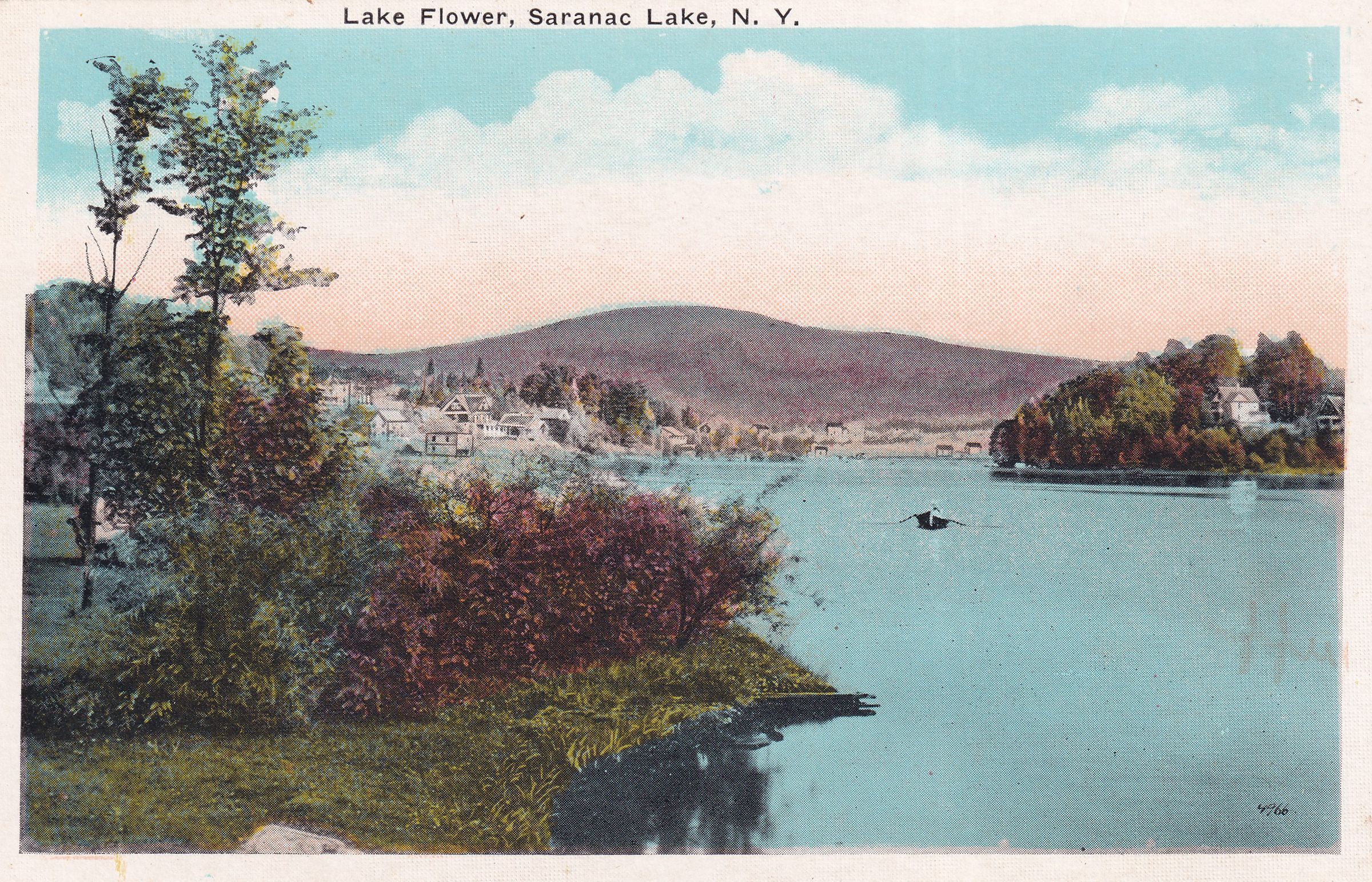 Color postcard showing Lake Flower, looking southeast from Riverside Park. Printed caption on front reads, "Lake Flower, Saranac Lake, N. Y." No printer's mark. Unused, divided back, white border.Subject Place