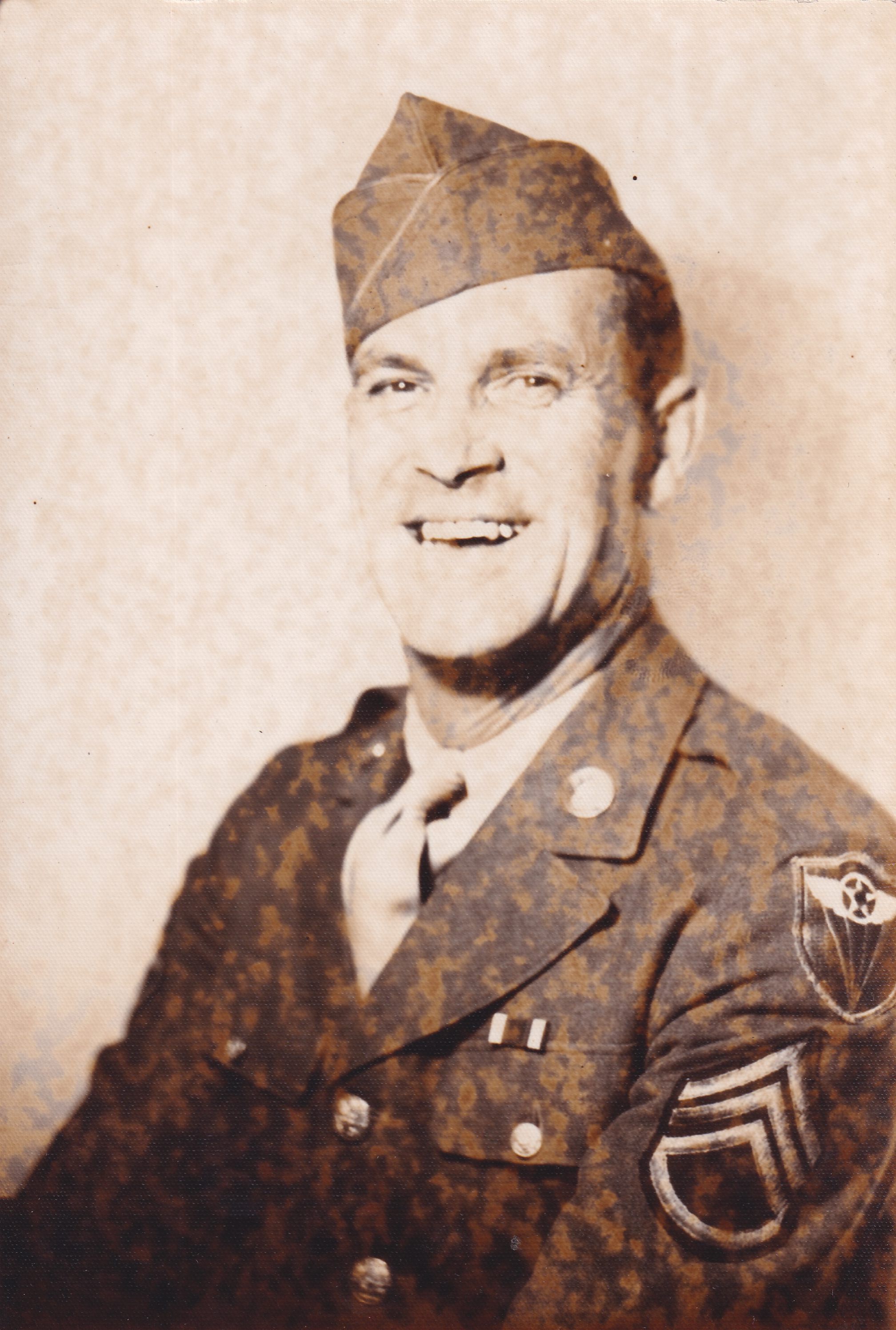 Black-and-White photograph of Carl Prue in his Air Force uniform. He is pictured in 3/4 profile and laughing.