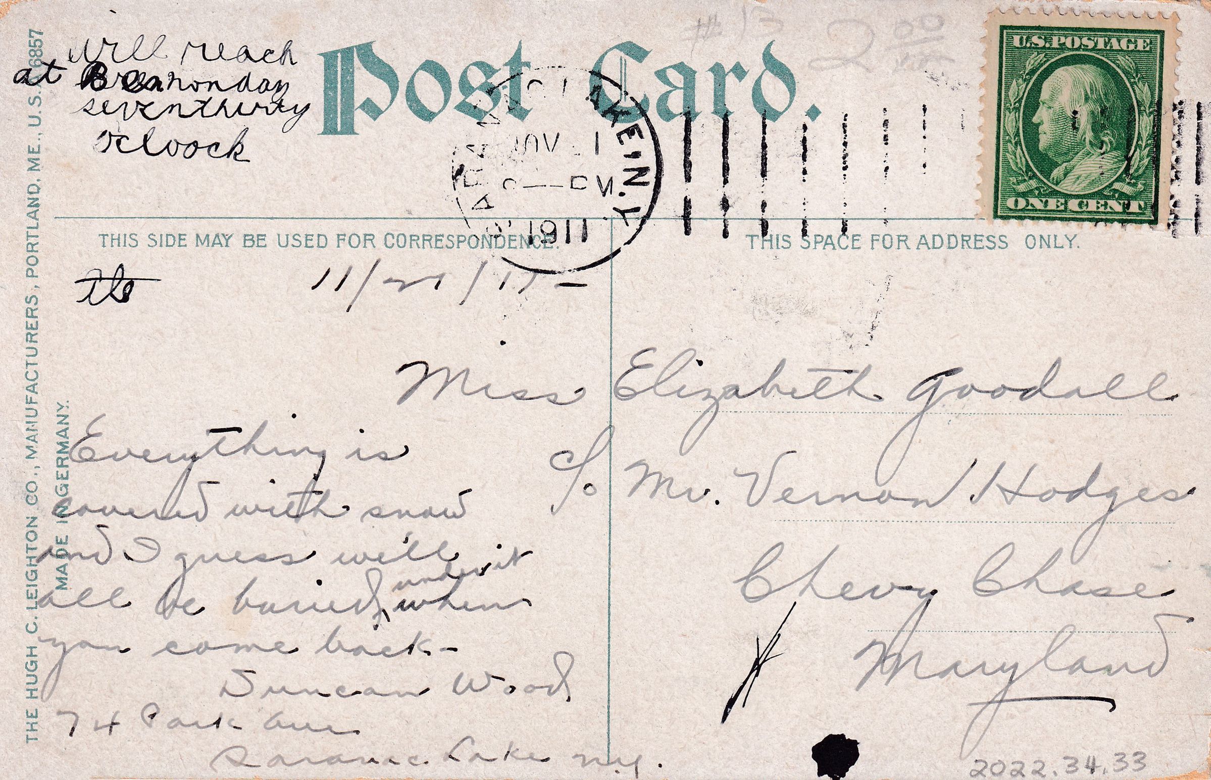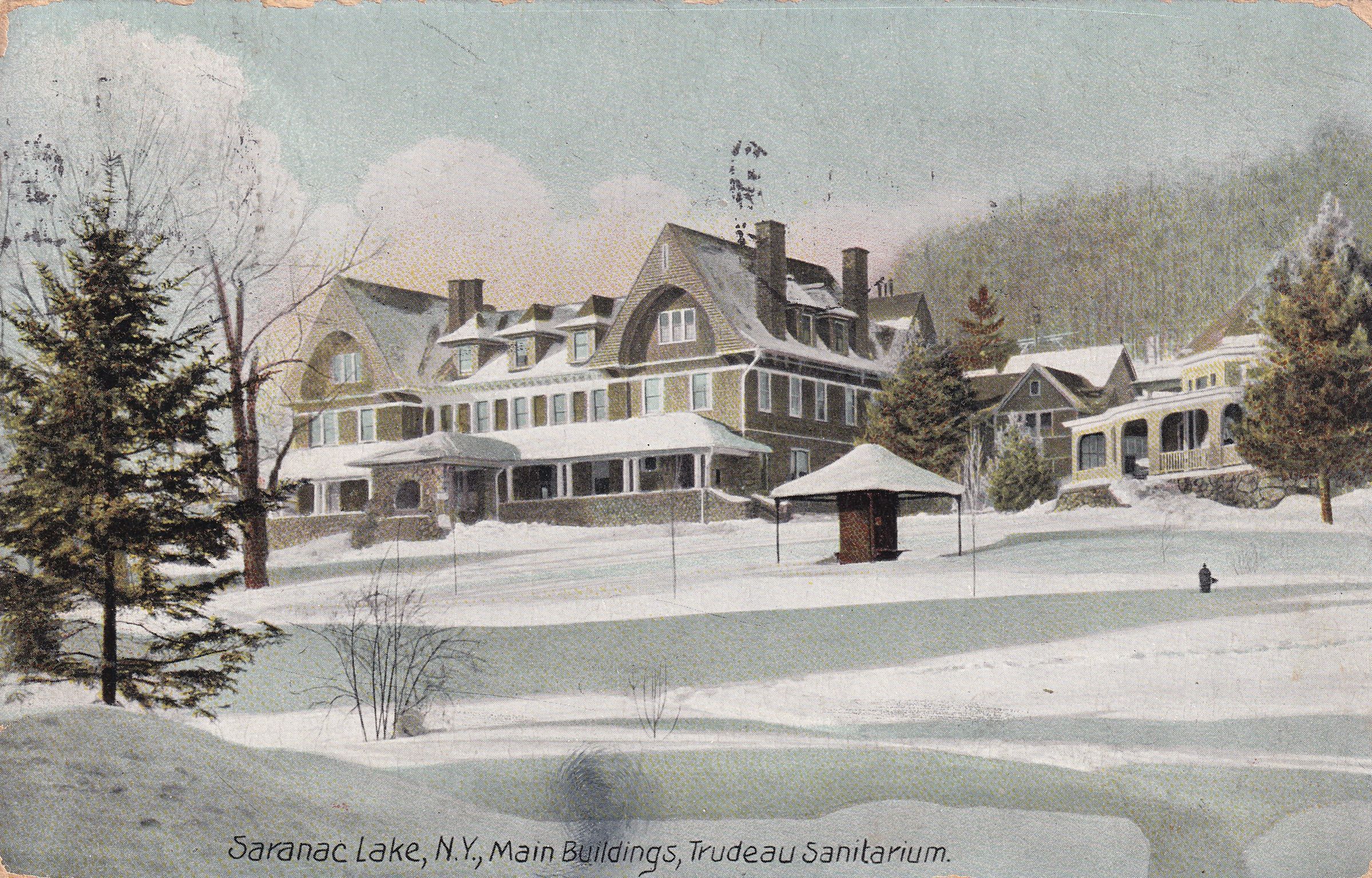 Color postcard showing the main building and what would later be named Trudeau Cottage at the Adirondack Cottage Sanitarium (later renamed Trudeau Sanatorium) in the snow. Printed caption on front reads, "Saranac Lake, NY, Main Buildings, Trudeau Sanitarium." Printed by the Hugh C. Leighton Co., Portland, ME. Used, divided back, postmarked Saranac Lake, November 21, 1911. Handwrittnen message on back reads, "11/21/22. Everything is covered with snow and I guess we'll all be buried under it when you come back. Duncan Wood, 74 Park Ave., Saranac Lake, N.Y." A note in different handwriting at top left reads, "Will reach at Monday seven thirty o'clock." Mailed to Miss Elizabeth Goodall, c/o Mr. Vernon Hodges, Chevy Chase, Maryland.Subject Place