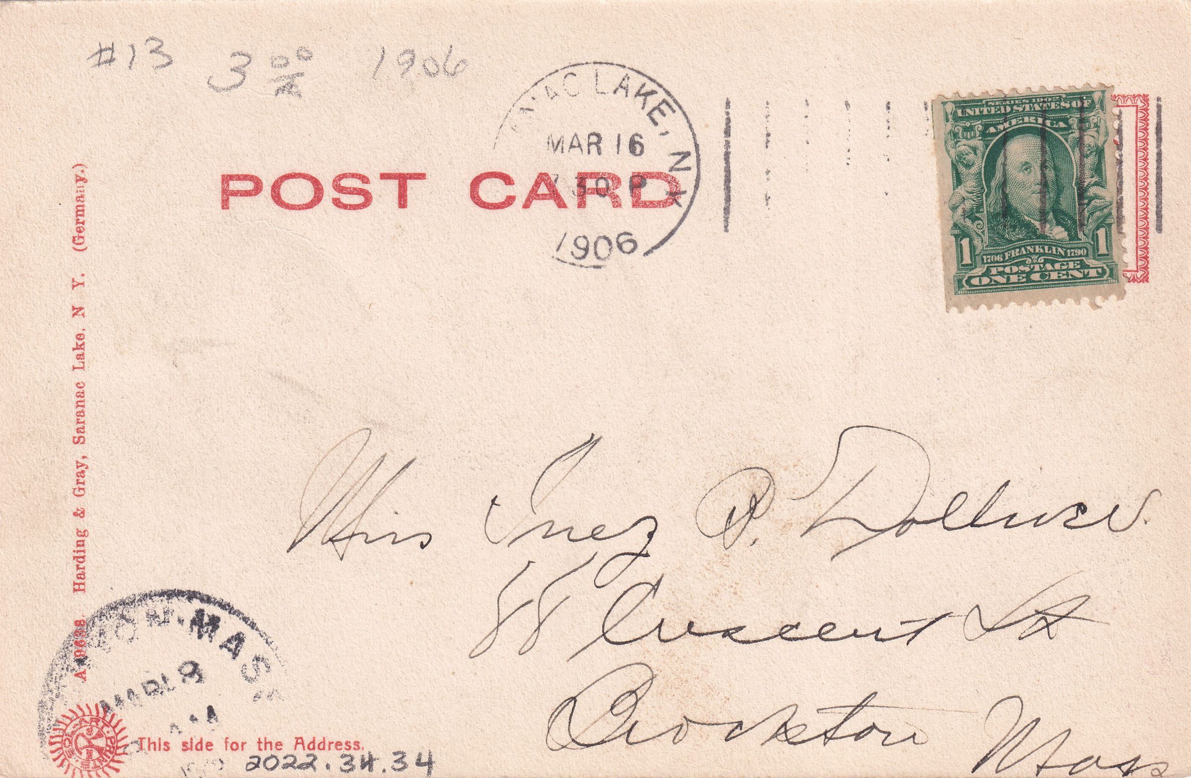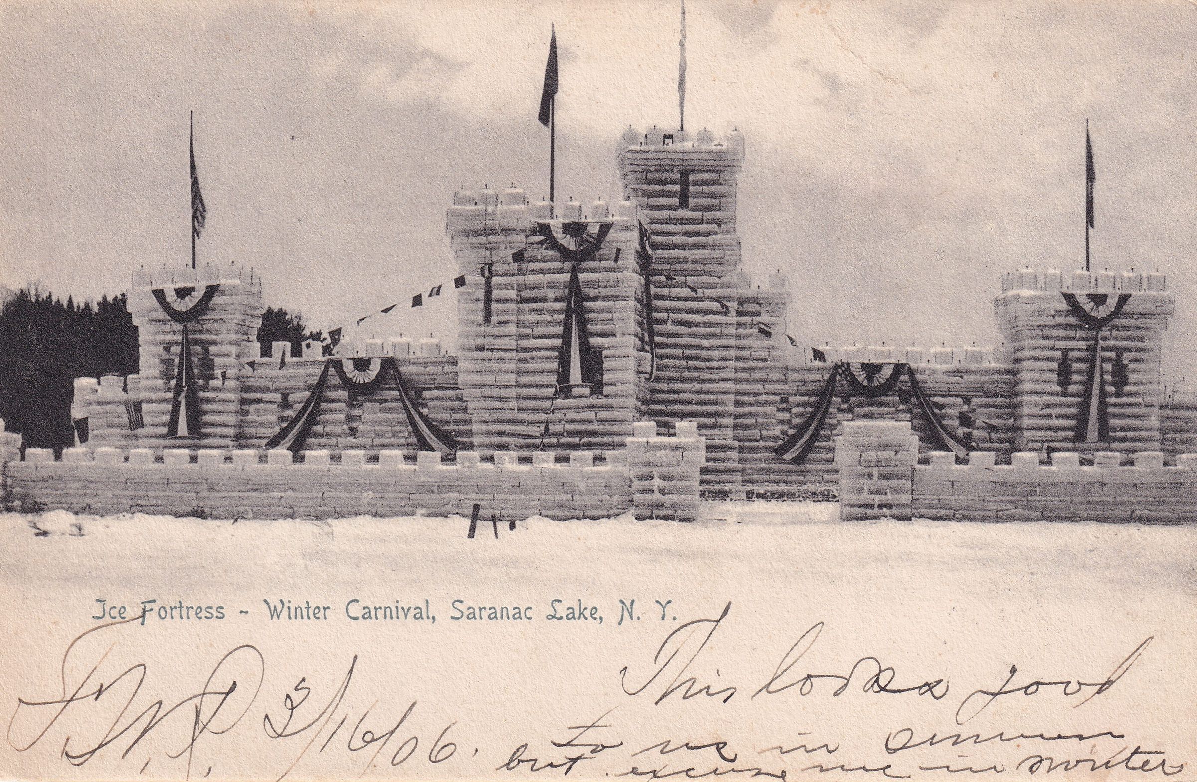 Black-and-white postcard showing an Ice Palace for an unidentified Winter Carnival, decorated with flags and bunting. Printed caption on front reads "Ice Fortress - Winter Carnival, Saranac Lake, N. Y." Printed by Harding & Gray, Saranac Lake, NY. Used, undivided back, white text box at bottom front, postmarked Saranac Lake, March 16, 1906. Handwritten message on front reads, "F. W. P. 3/16/06. This looks good to us in summer but excuse me in winter." Mailed to Miss Inez P. Dolliver, 88 Crescent St., Brockton, Mass.Subject Place