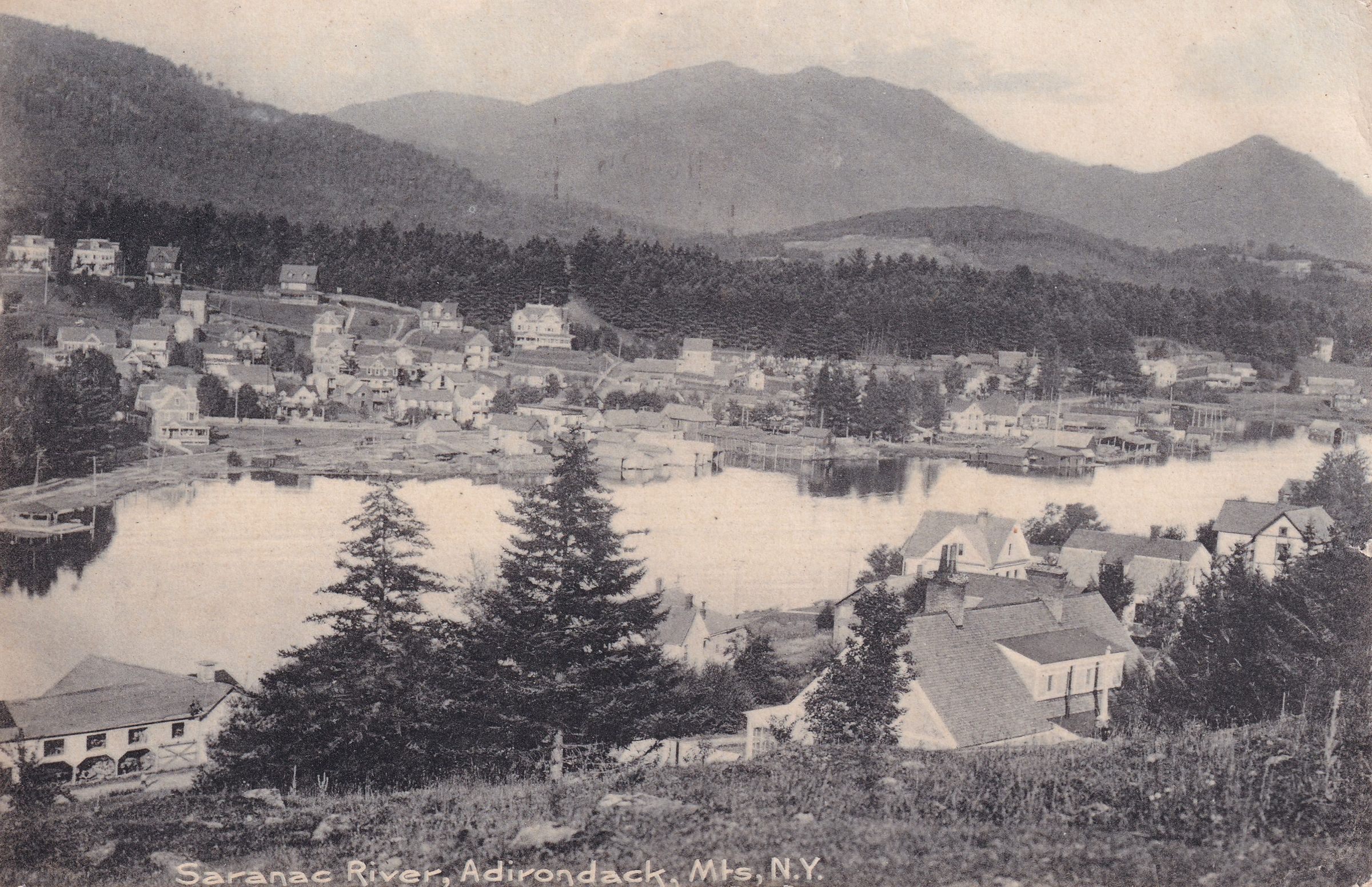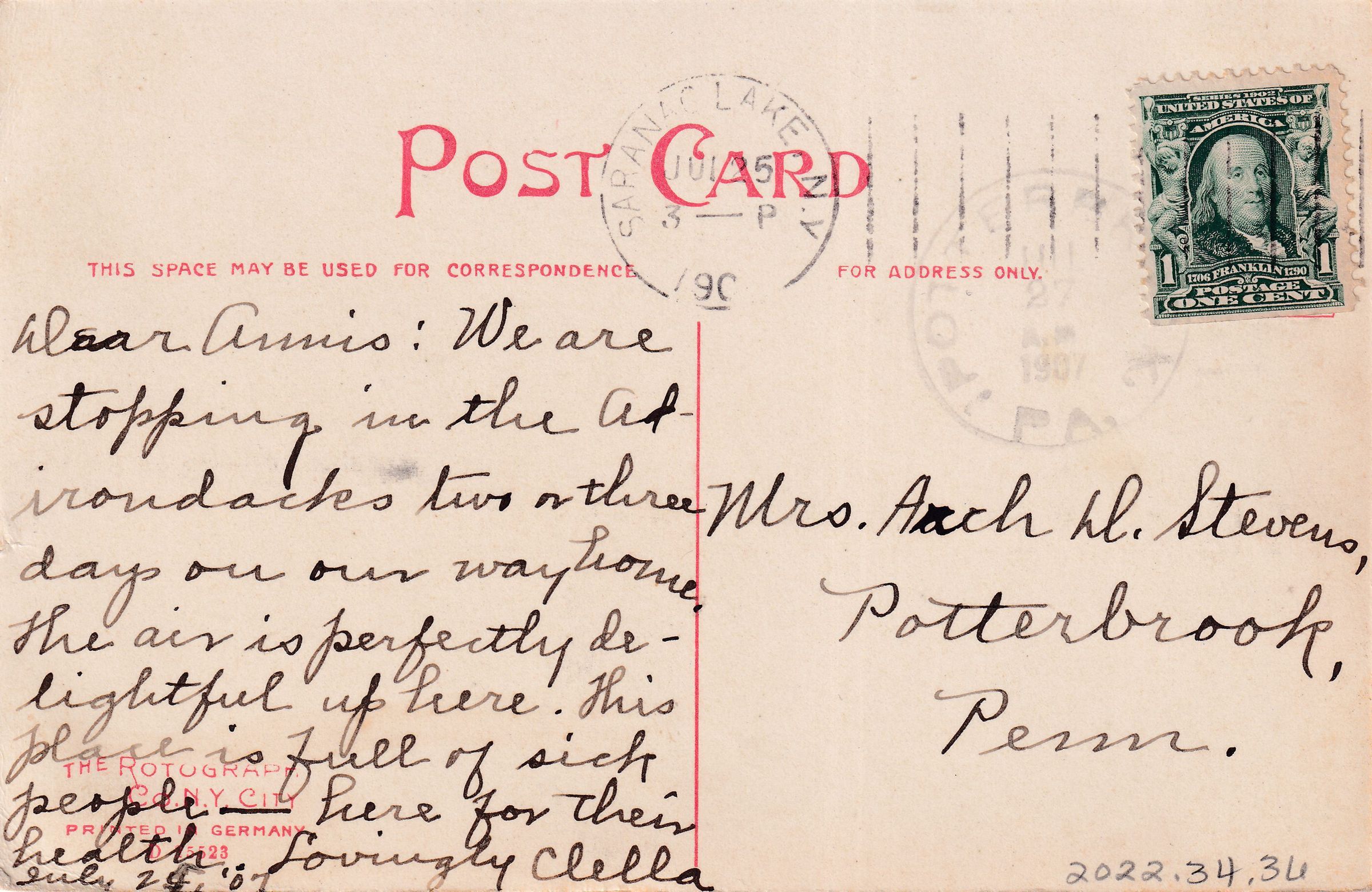 Black-and-white postcard showing a view of the Saranac River / Lake Flower and Saranac Lake from Blood Hill / Lake Street Hill. Buildings are visible on both sides of the water, including the two Alta Vista Lodge buildings on Helen Hill prior to being combined. Printed caption on front reads, "Saranac River, Adirondack, Mts., N. Y." Printed by the Rotograph Co., NY City. Used, divided back, postmarked Saranac Lake, July 25, 1907. Handwritten message on back reads, "Dear Annis: we are stopping in the Adirondacks two or three days on our way home. The air is perfectly delightful up here. This place is full of sick people--here for their health. Lovingly, Clella, July 25, '07." Mailed to Mrs. Arch D. Stevens, Potterbrook, Penn.Subject Place