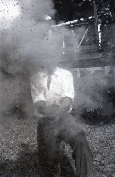 Negative of a kneeling Henry Ives Baldwin with a cloud of dirt or smoke obscuring his face. He has his hands extended. Most likely taken by Mary Ives Baldwin. This item is not fully cataloged but has been uploaded so the image is publicly available; if you would like us to prioritize cataloging this item, please contact the HSL Collections team.