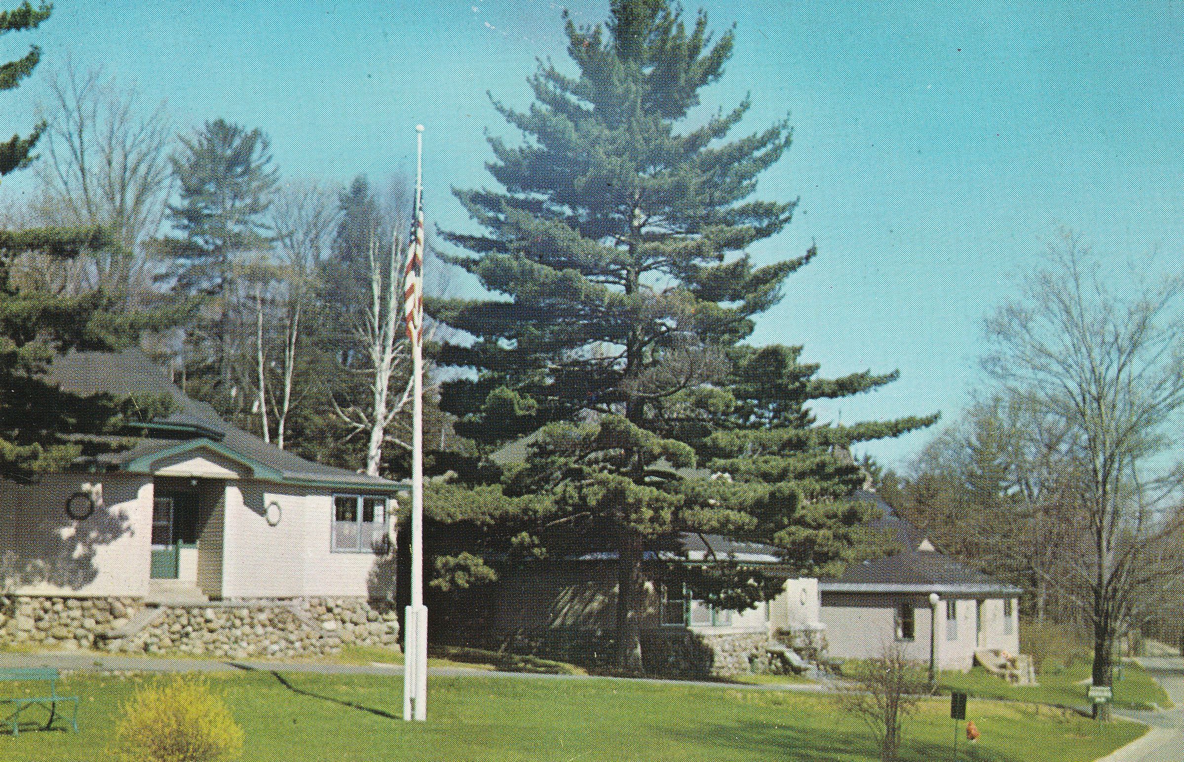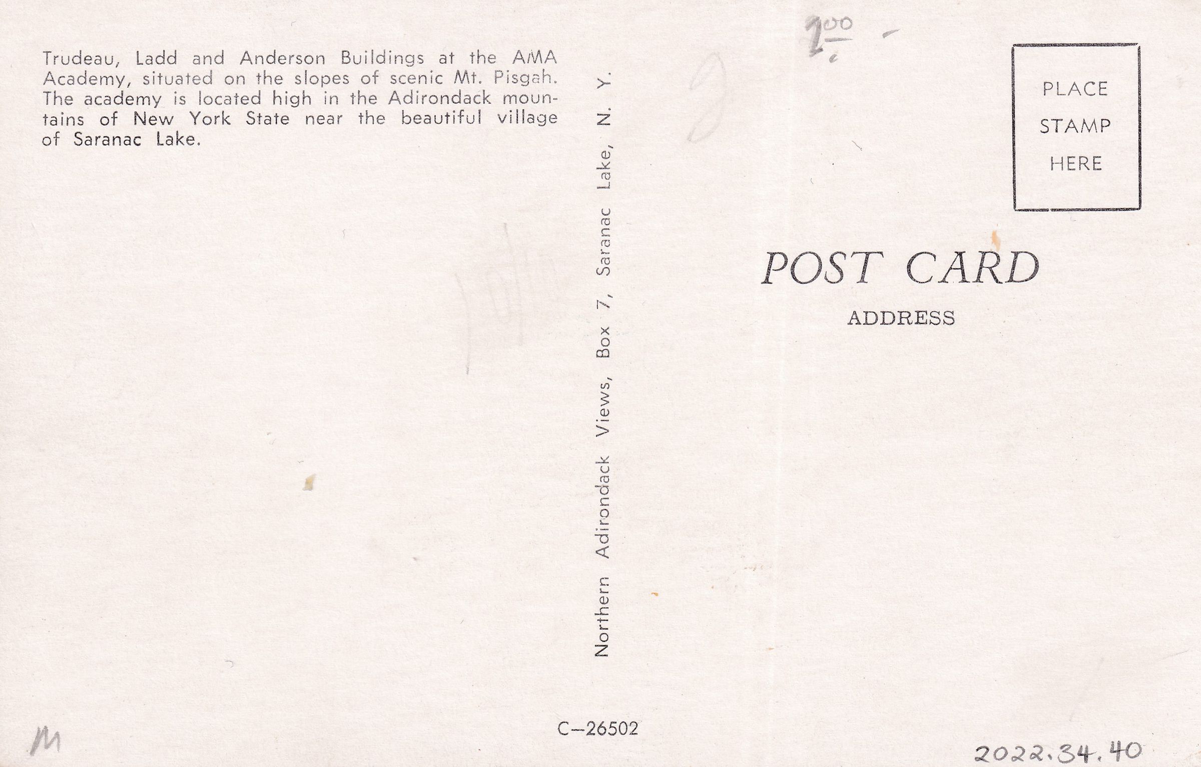 Color postcard showing three cottages at the American Management Association campus, formerly Trudeau Sanatorium. Printed caption on back reads, "Trudeau, Ladd, and Anderson Buildings at the AMA Academy, situated on the slopes of scenic Mt. Pisgah. The academy is situated high in the Adirondack Mountains of New York State near the beautiful village of Saranac Lake." Printed by Northern Adirondack Views, Saranac Lake, NY. Unused, divided back.Subject Place