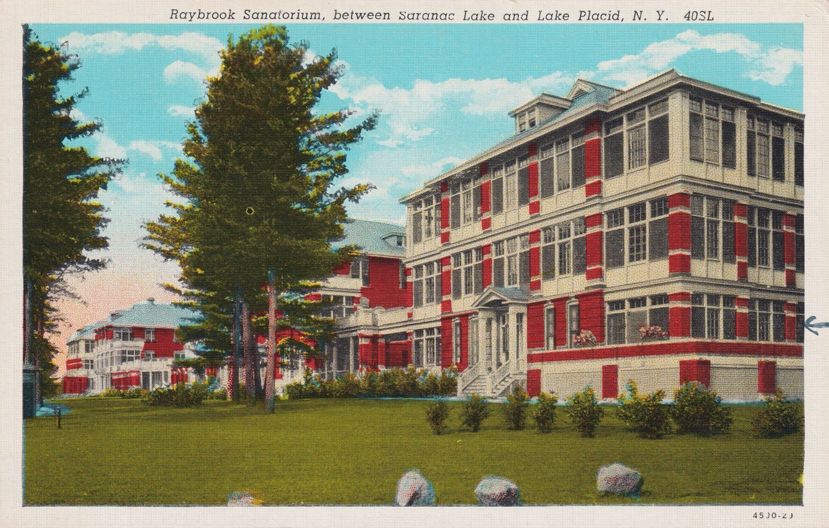 Color postcard showing the main building at Ray Brook Sanatorium. Printed caption on front reads, "Raybrook Sanatorium, between Saranac Lake and Lake Placid, N. Y." Black hand drawn black arrow points at room on right-hand side of building. Printed by C. W. Hughes & Co., Inc., Mechanicville, NY. Used, divided back, white border, not mailed.