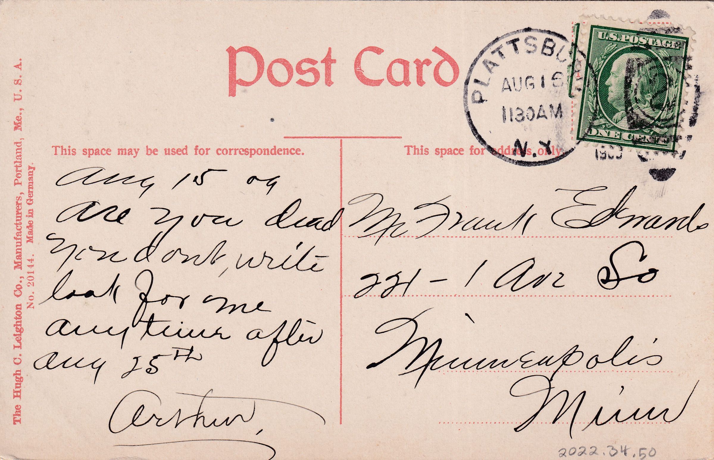 Color postcard showing the intersection of Broadway and Main Street, including the Berkeley Hotel. Horse drawn wagons can be seen on the roads. Printed caption on front reads, "The Berkeley Hotel and Main Street Saranac Lake, Adirondack Mts." Printed by the Hugh C. Leighton, Co., Portland, ME. Used, divided back, postmarked Plattsburgh, NY, August 16, 1909. Handwritten message on back reads, "Aug 15, 90. Are you dead you don't write. Look for me anytime after Aug 25th. Arthur." Mailed to Mr. Frank Edwards, 221-1 Ave So, Minneapolis, Minn.Subject Place