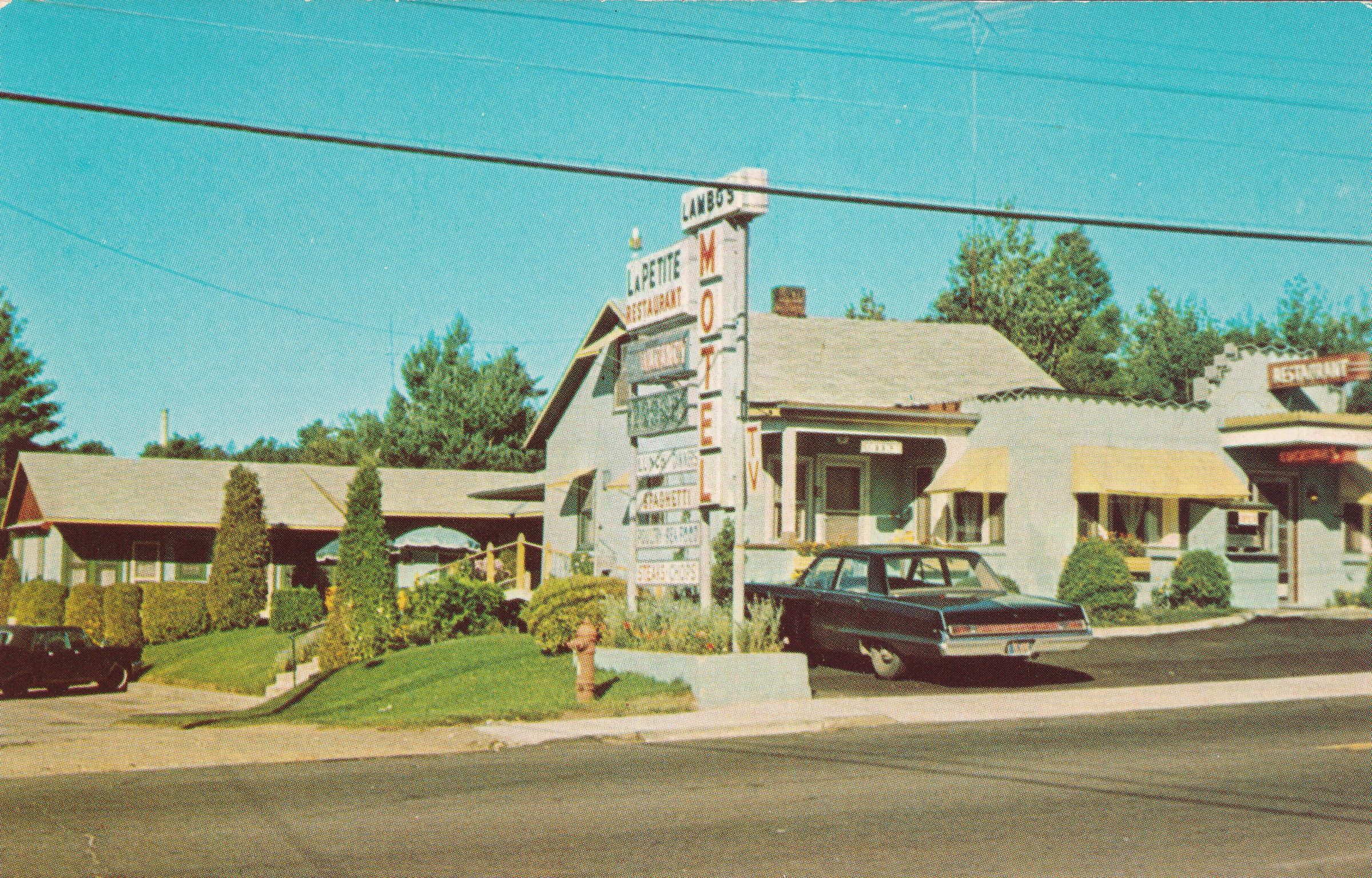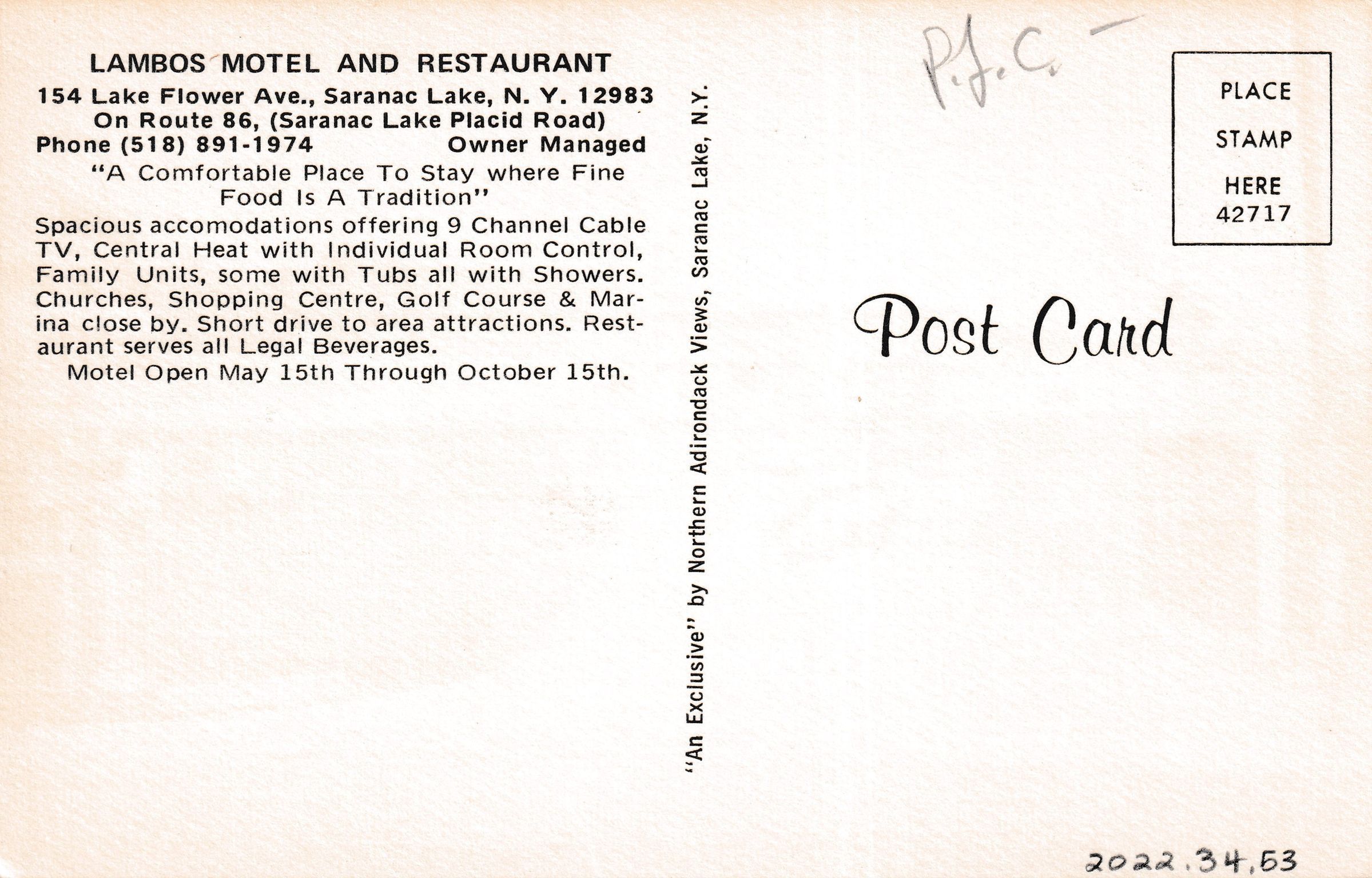 Color postcard showing a motel and restaurant with a car parked in front. Printed caption on back reads, "Lambos Motel and Restaurant" with description of accomodations. Printed by Northern Adirondack Views, Saranac Lake, NY. Unused, divided back.Subject Place