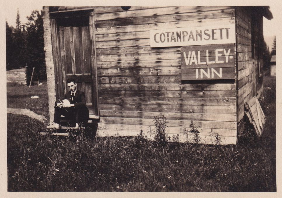 Black-and-White photograph of an unidentified man seated on the front steps of a small wooden shack. There is a hand-painted sign hanging on the building reading, "Cotanpansett Valley Inn." The photograph was likely printed by Kollecker's Kodak and Gift Shop.
