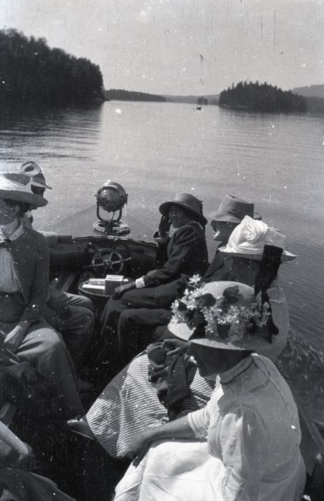 Negative of four unidentified women and one man sitting at the back of a motor boat on a lake or river. Most likely taken by Mary Ives Baldwin. This item is not fully cataloged but has been uploaded so the image is publicly available; if you would like us to prioritize cataloging this item, please contact the HSL Collections team.