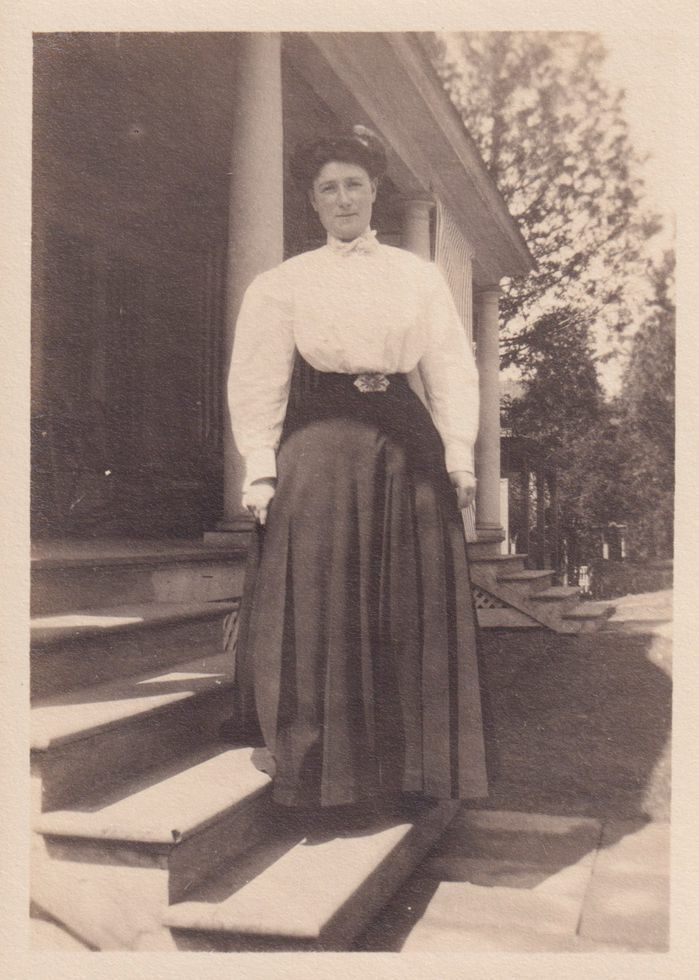 Black-and-White photograph of a woman standing on the steps of a house. Was in an envelope marked, "Stickney - Saranac Lake." Photograph was developed by Kollecker's Kodak and Gift Shop. Negative is 2024.2.34.17.