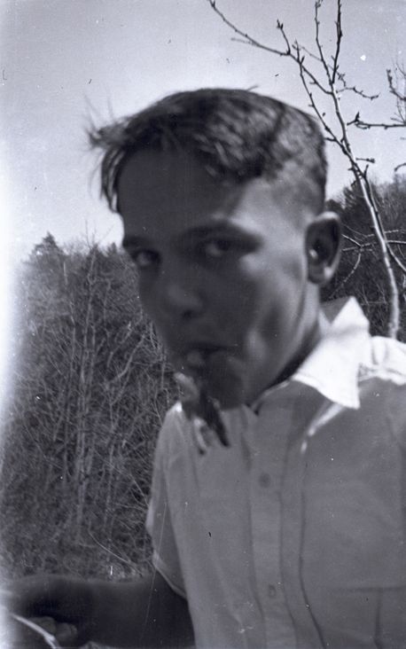 Negative of Henry Ives Baldwin holding an unknown object in his mouth. He is outside. Most likely taken by Mary Ives Baldwin. This item is not fully cataloged but has been uploaded so the image is publicly available; if you would like us to prioritize cataloging this item, please contact the HSL Collections team.