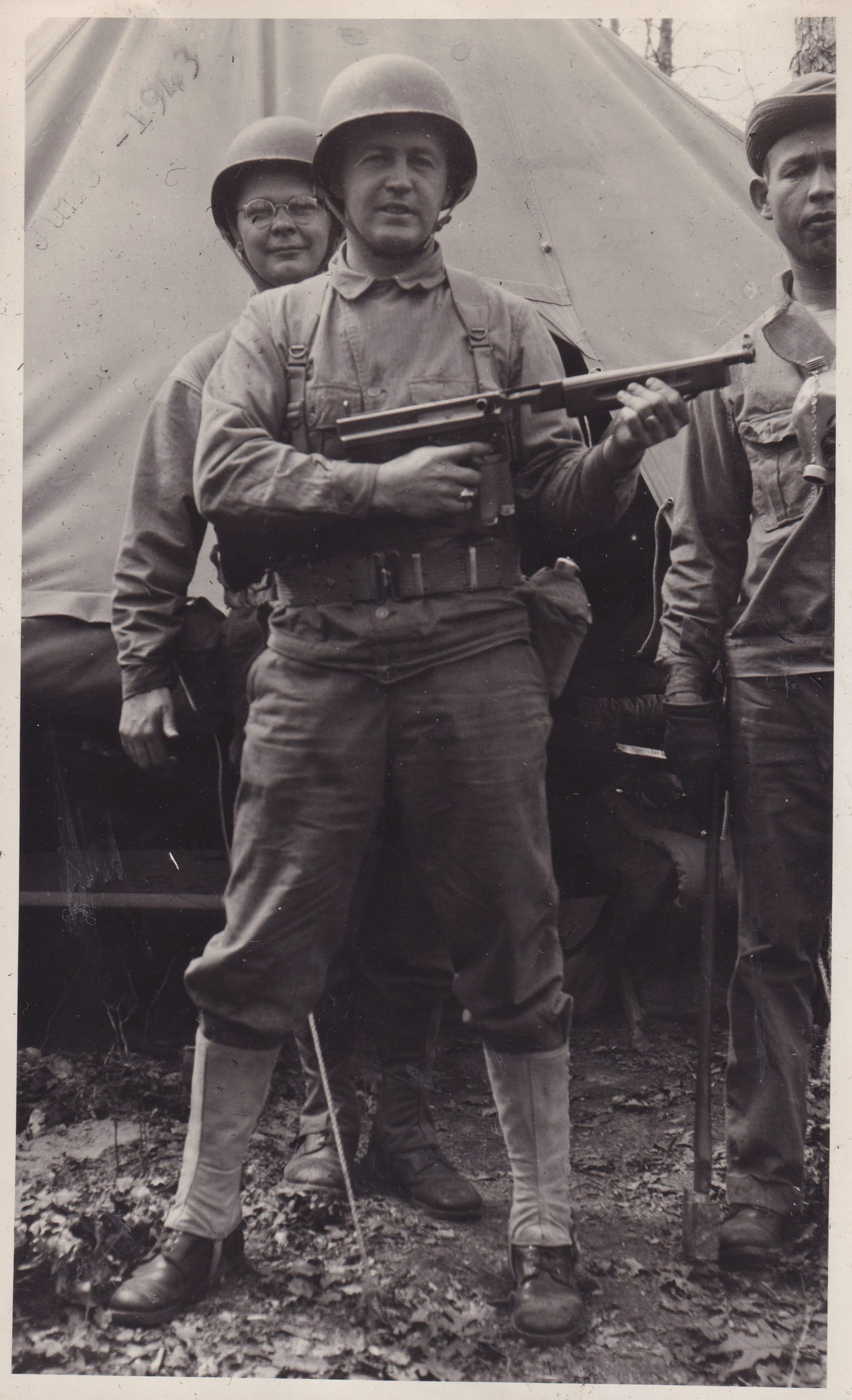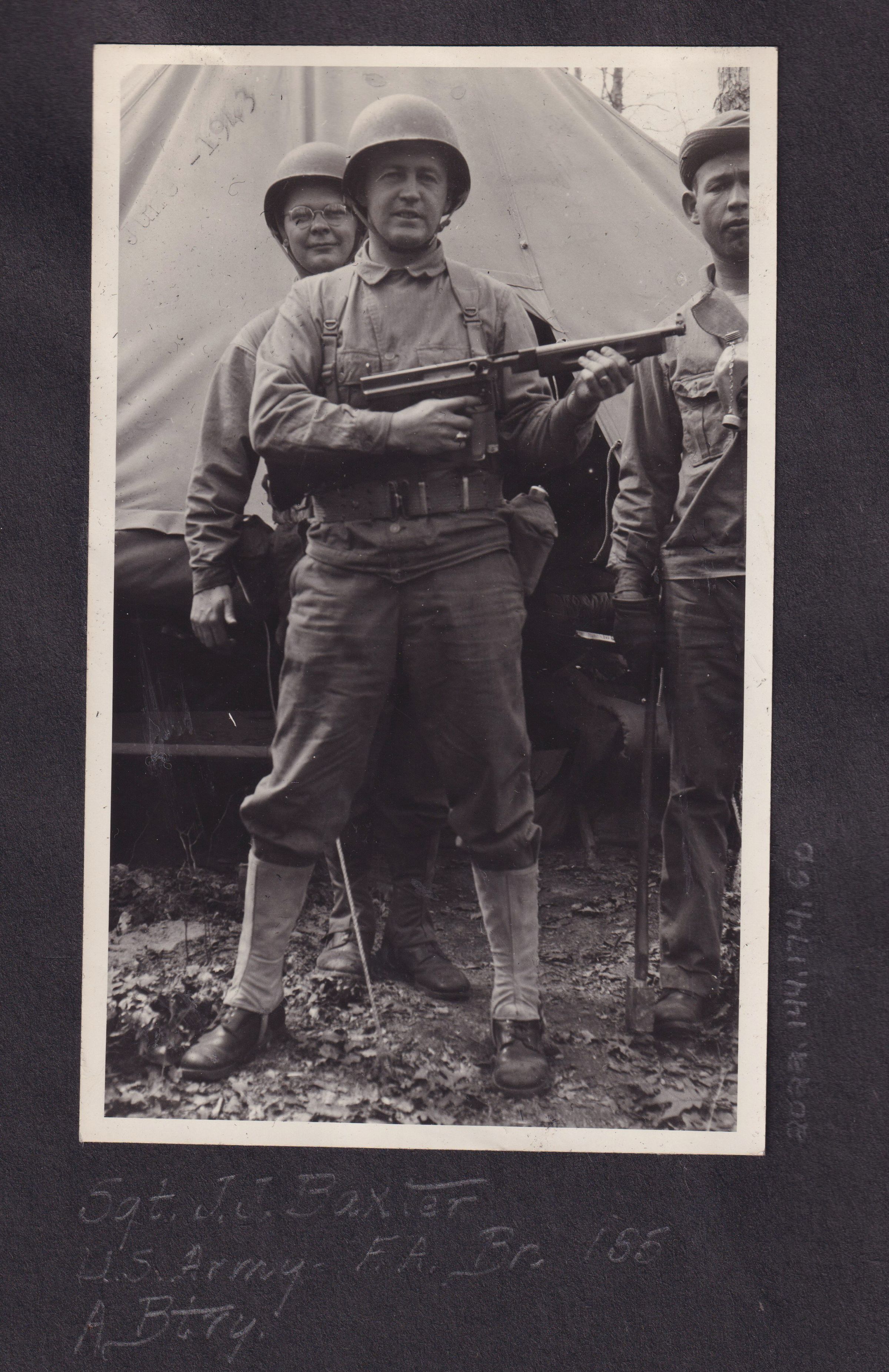Black-and-White photograph of a man in military uniform holding a gun across his chest. There are two other soldiers behind him. Handwritten caption on page reads, "Sgt. J.J. Baxter, U.S. Army, F.A. Bn 186. A Btry." Typewritten caption on front of photograph reads, "June 1943."Lexicon