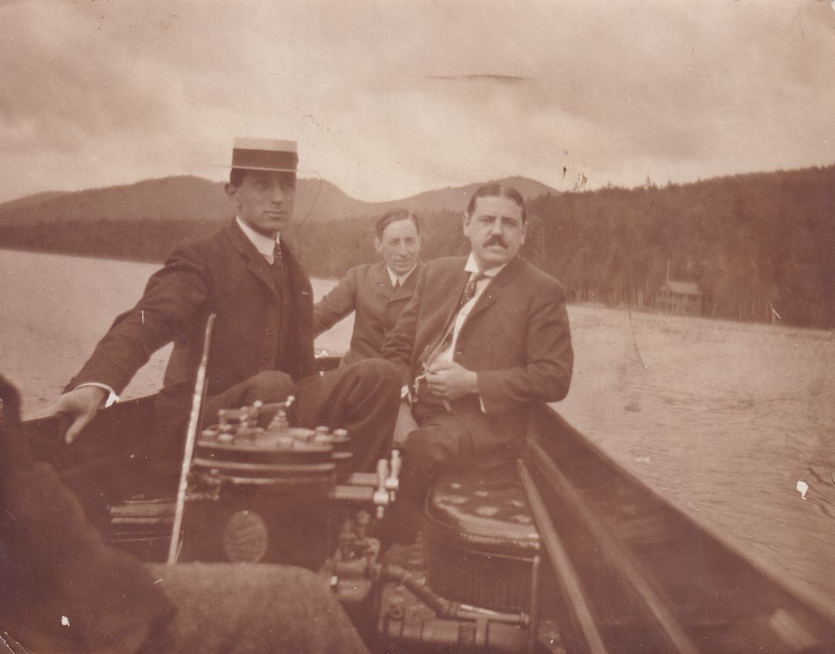 Photograph of at least four men sitting in a boat. Three men are fully in frame, while the side of another can be seen at the bottom and left edge of the photo. There is a mechanical item, maybe a camera, sitting between the groups of men. The edge of the forest at the shore and mountains beyond can be seen behind the boat.Lexicon