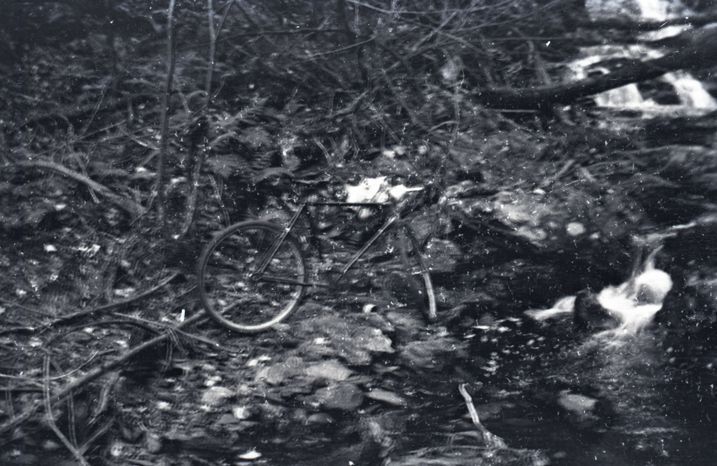 Slightly blurry negative of a bicycle in the woods next to a stream. Most likely taken by Mary Ives Baldwin. This item is not fully cataloged but has been uploaded so the image is publicly available; if you would like us to prioritize cataloging this item, please contact the HSL Collections team.