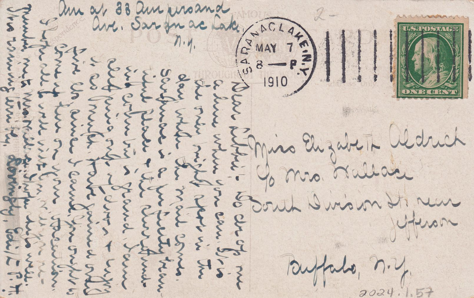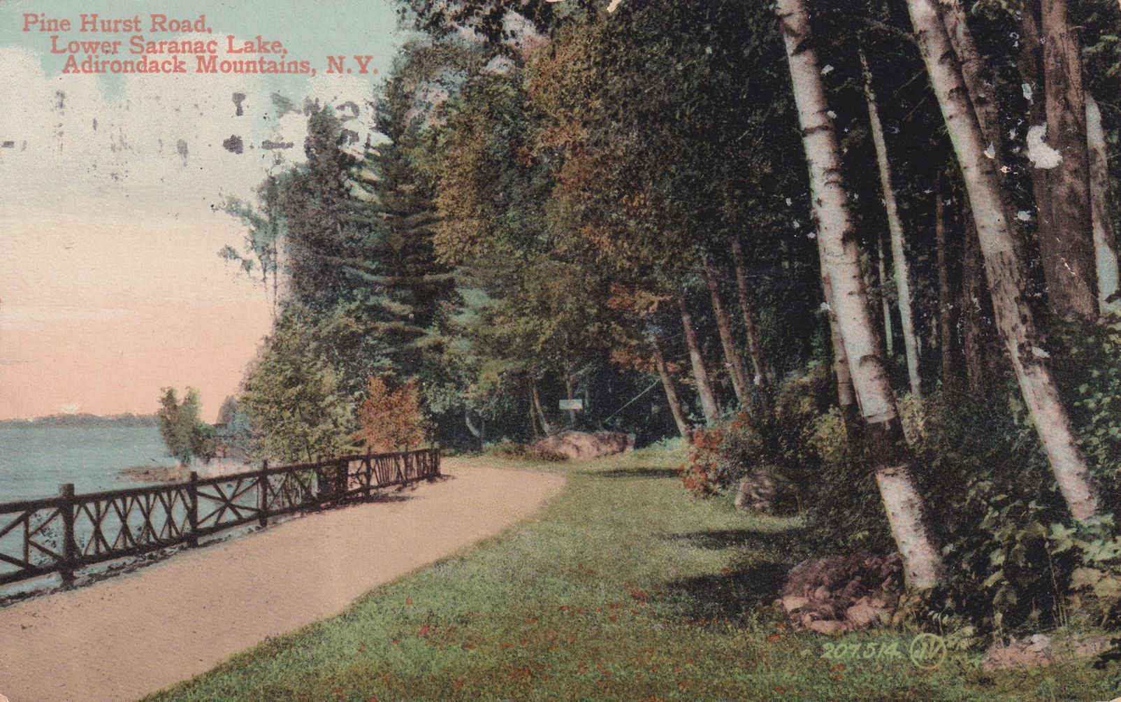 Color postcard showing a road along a body of water. Printed caption on front reads, "Pine Hurst Road, Lower Saranac Lake, Adirondack Mountains, N.Y." Printed by Valentine & Sons' Publishing Co., Ltd., New York. Used, divided back, postmarked Saranac Lake, May 7, 1910. Handwritten message on back reads, "Dear Libbie: Do drop me a line when you can. It is the only bright spot in the day, when the mail comes. Saranac is a perfectly beautiful place & the surrounding country is grand. I am sleeping out of doors & enjoy it so much. Have gained over five lbs since I came. You ought to come up here on your vacation. I hope all is well with you, will you remember me to Mrs. Wallace. I hope she is well. It is raining terrible. Lovingly, Edith P.H. Am at 33 Ampersand Ave., Saranac Lake, N.Y." Mailed to Miss Elizabeth Aldrich, c/o Mrs. Wallace, South Division St. near Jefferson, Buffalo, NY.Subject Place