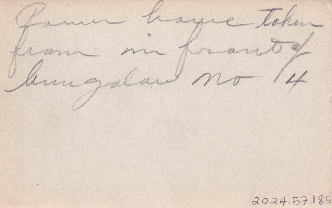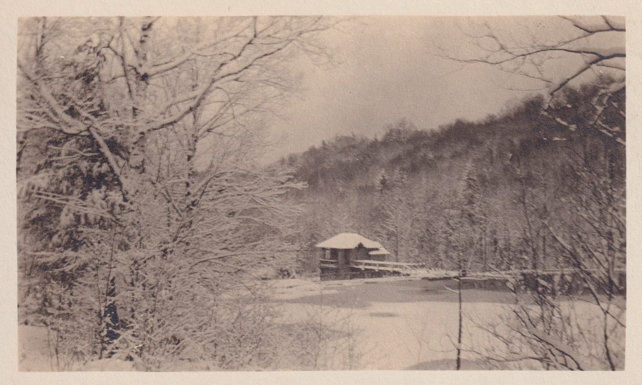 Black-and-White photograph of the power house at Bartlett Carry Club in the winter. Handwritten note on reverse reads, "Power house taken from in front of Bungalow no. 4."