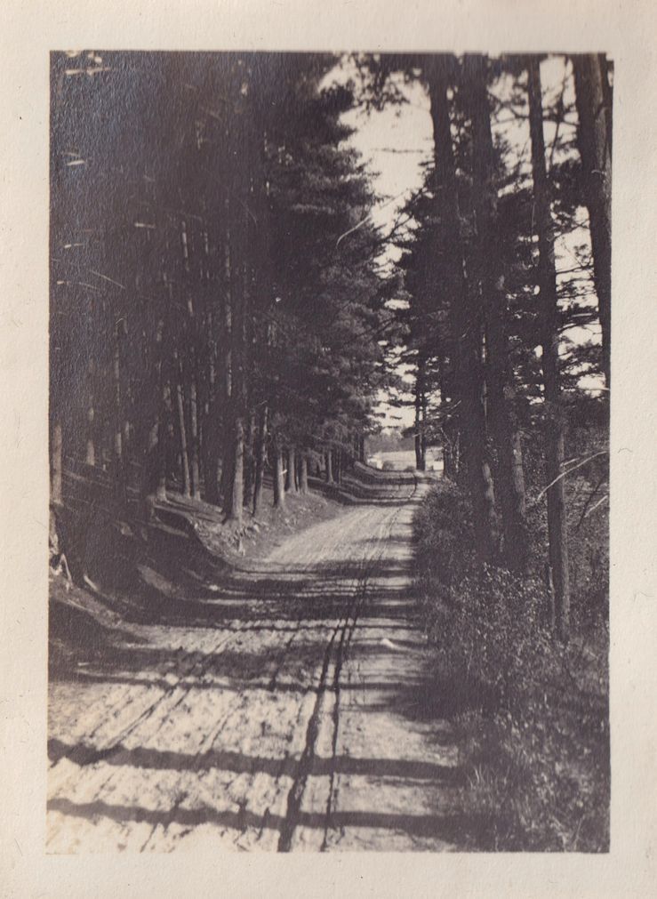 Black-and-white photograph of a dirt path or thin road leading through a wooded area. There is a lake at the end of the path.