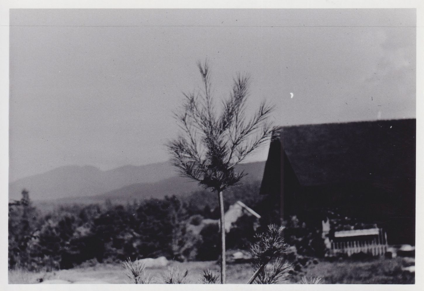 Black-and-White photograph showing of a small evergreen tree. A cottage at Bartlett Carry Club can be seen in the background. Handwritten note on reverse reads, "1932." Note from Fran Yardley reads, "Douglass. The view was much better then!"