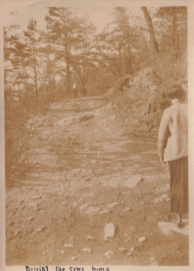 Black-and-white photograph of a woman walking on a dirt path through a wooded area. There is another person farther up the path. "Driving the cows home" is written in ink beneath the photograph.