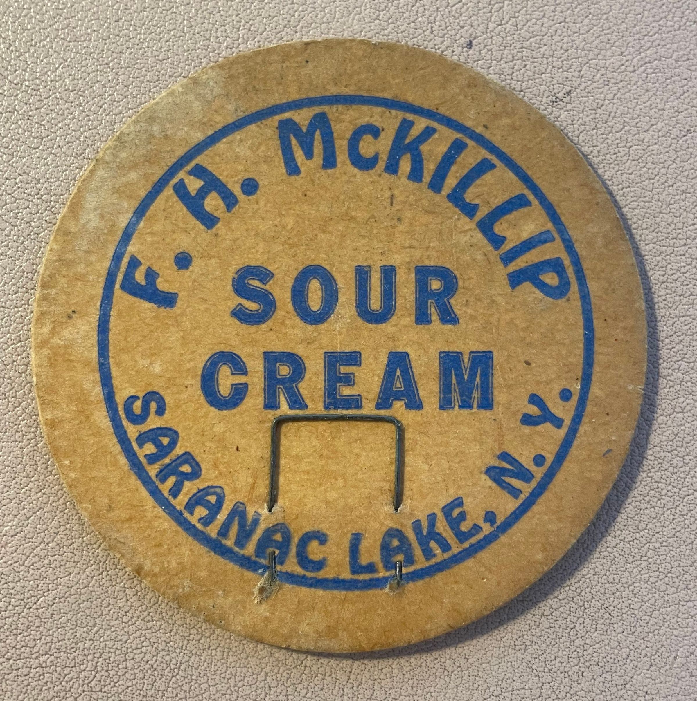 Cardboard bottle cap from F. H. McKillip Dairy. Center reads, "F. H. McKillip, Sour Cream, Saranac Lake, N.Y." in blue ink.