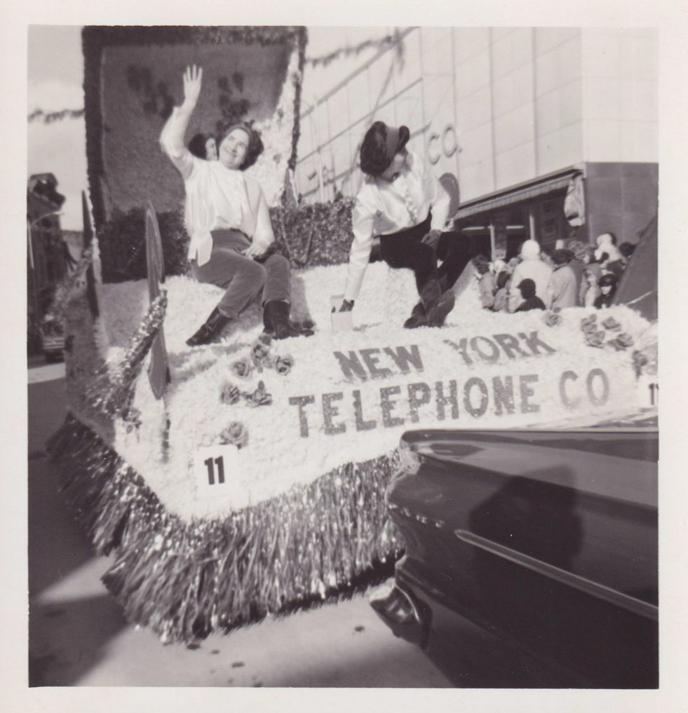 Black-and-White photograph of the New York Telephone Co. float in the Winter Carnival parade. The facade of the Newberry's building can be seen behind the float. The photograph was likely printed by Kollecker's Kodak and Gift Shop.