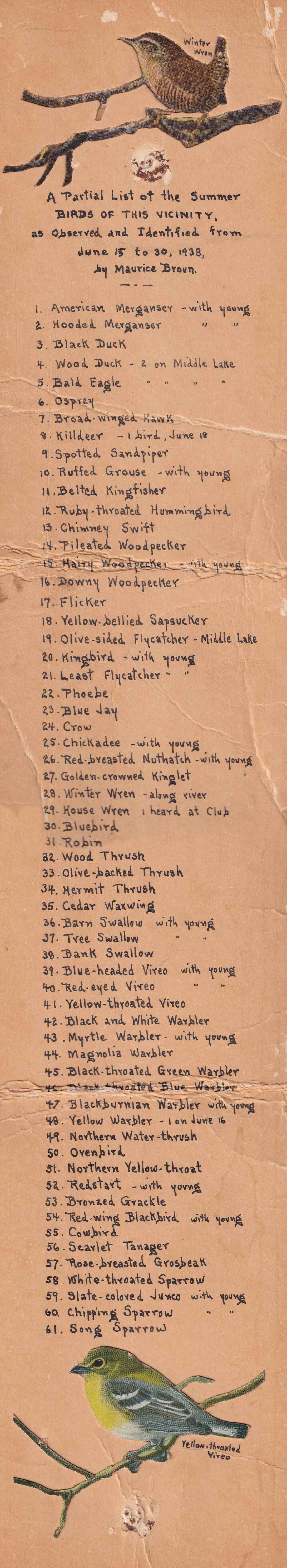 List entitled, "A Partial List of the Summer Birds of this Vicinity, as Observed and Identified from June 15 to 30, 1938, by Maurice Brown." Handwritten on thin cardboard, with illustrations of a Winter Wren and Yellow-Throated Vireo pasted at top and bottom. Was among papers of Bartlett Carry Club.Lexicon