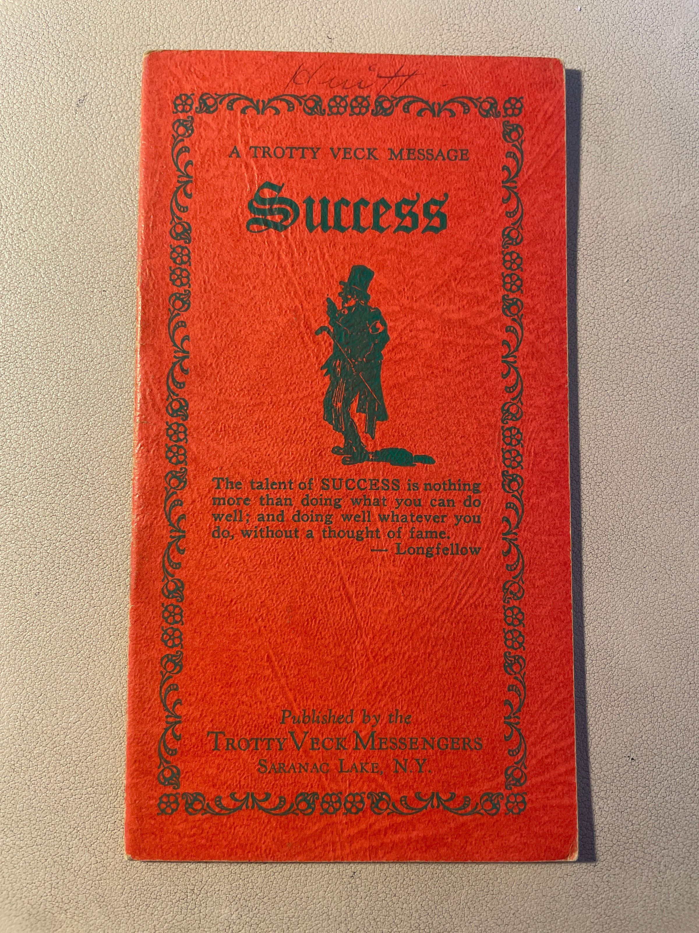 Trotty Veck Message: Success. Copyright 1938. Softcover, red cover, green ink.