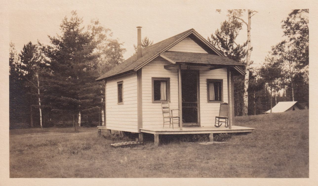Black-and-White photograph of a small cabin with a front porch. The photograph was likely printed by Kollecker's Kodak and Gift Shop.