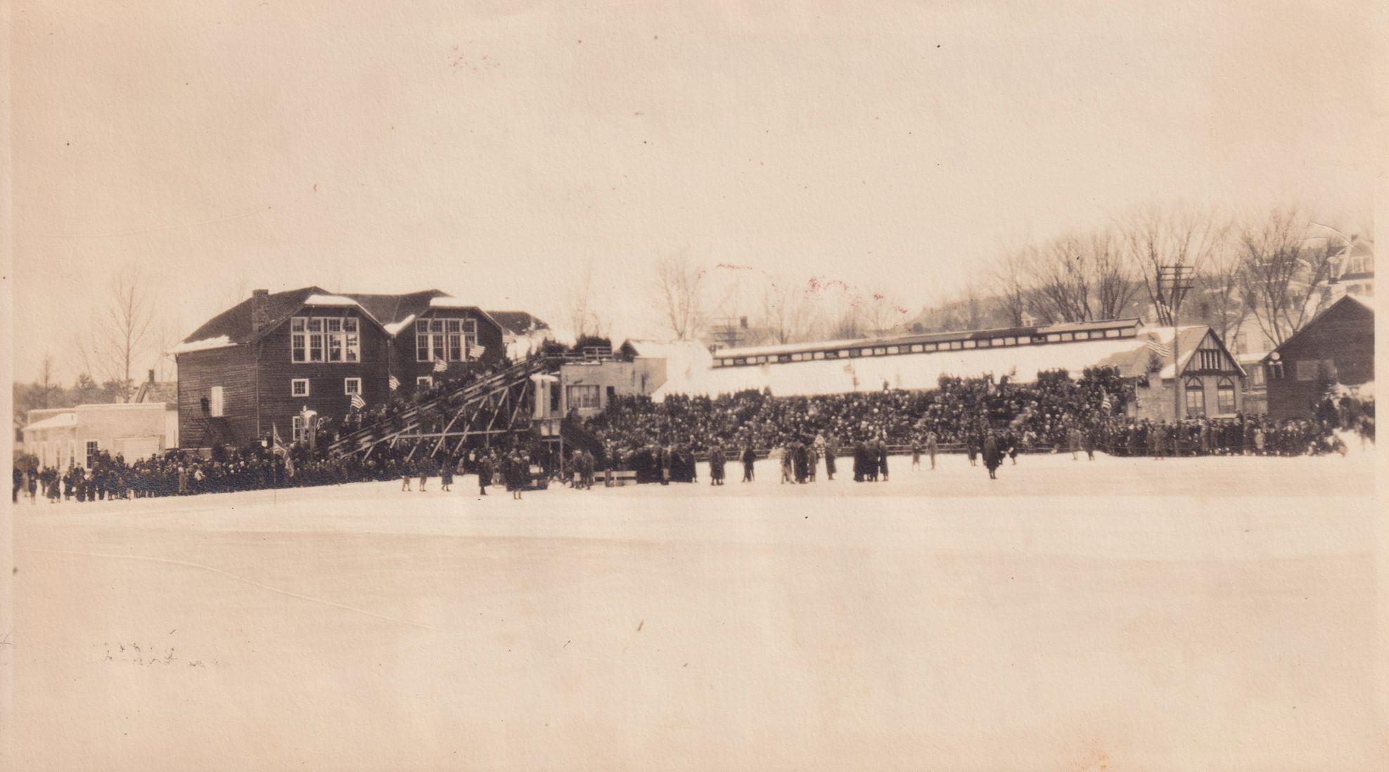 Black and white photograph of the ice skating rink, club building, and stands at Pontiac Bay on Lake Flower. There are groups of people in fur coats standing on the ice.