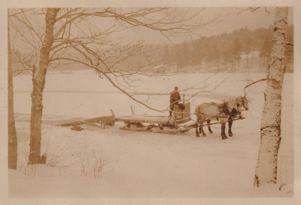 Black-and-White photograph of a horse-drawn ice cutting sled on Ampersand Bay. A worker is standing on the sled near the horses, and the end of the sled is tipped into the water.