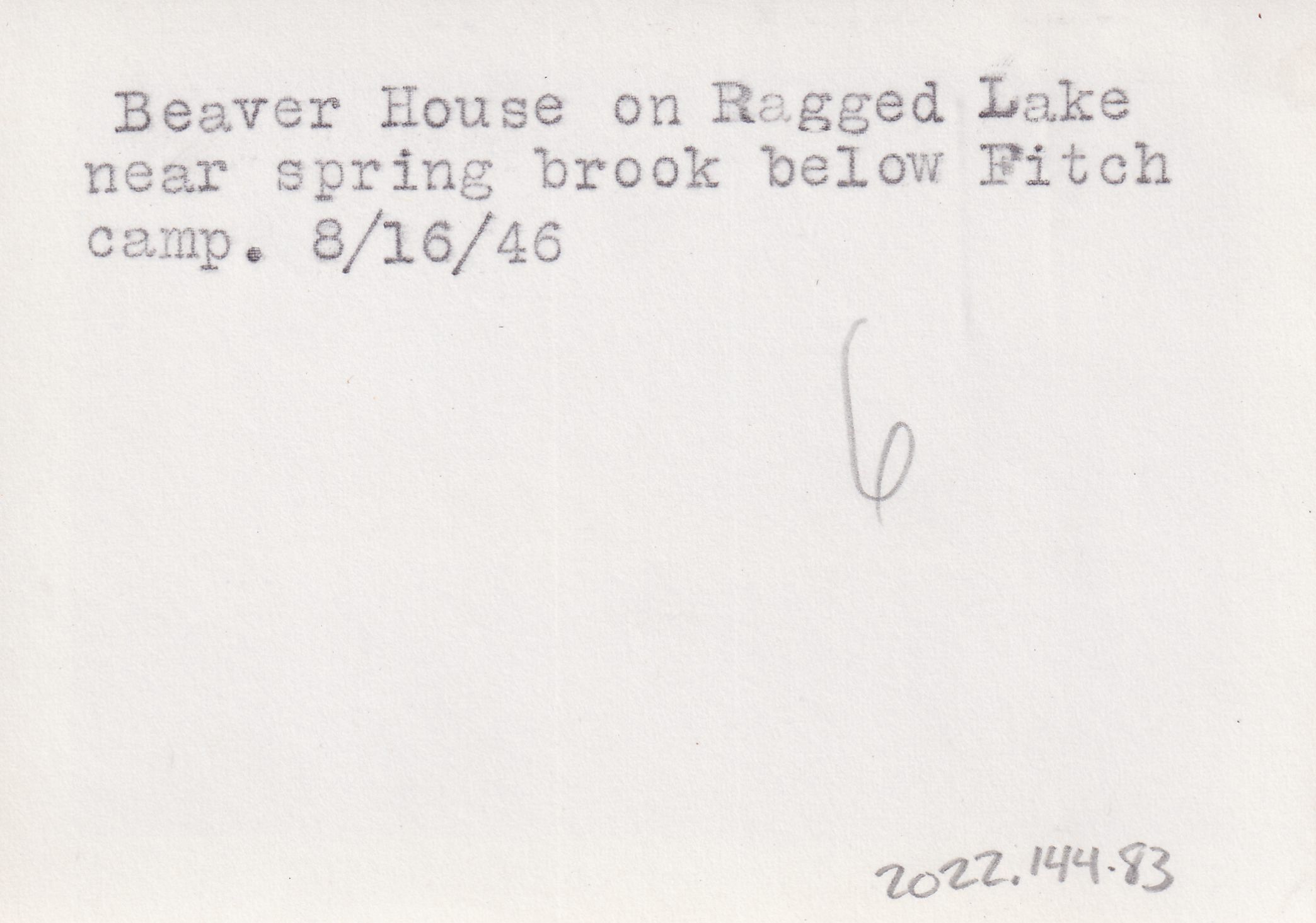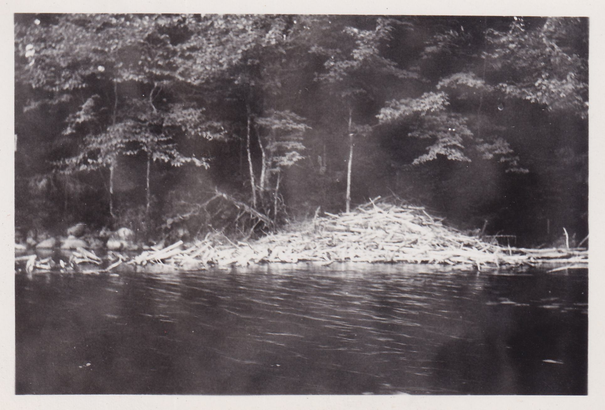 Black-and-White photograph of a beaver dam on a body of water. Typewritten caption on back reads, "Beaver house on Ragged Lake near spring brook below Fitch Camp. 8/16/46."