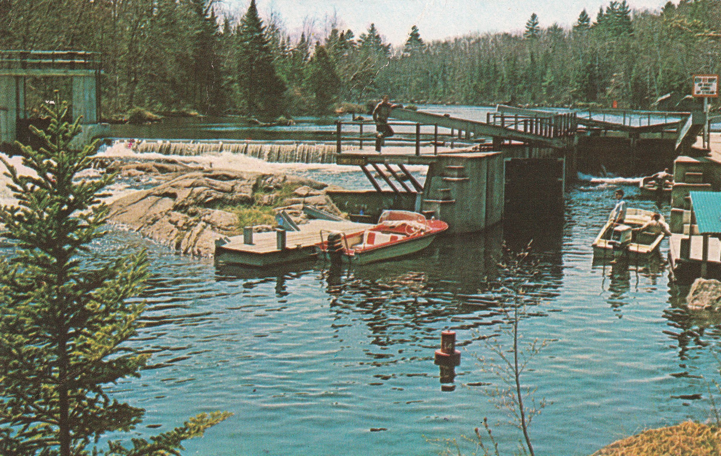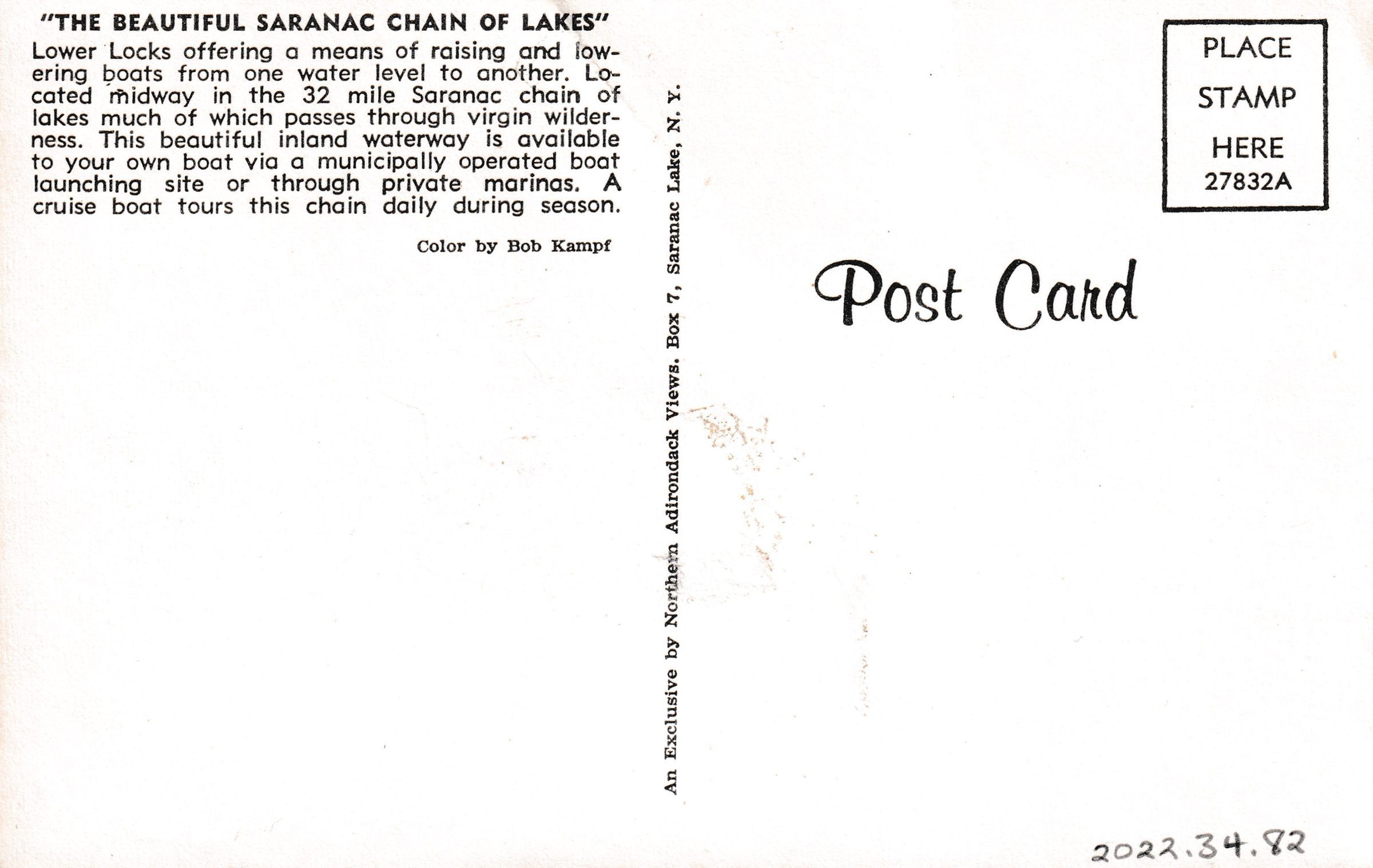 Color postcard showing boats at the Lower Locks. A person is standing holding the lock open. Printed caption on back reads, "the Beautiful Saranac Chain of Lakes," with information about the locks. Printed by Northern Adirondack Views, Saranac Lake. Photo by Bob Kampf. Unused, divided back, scalloped edges.Subject Place