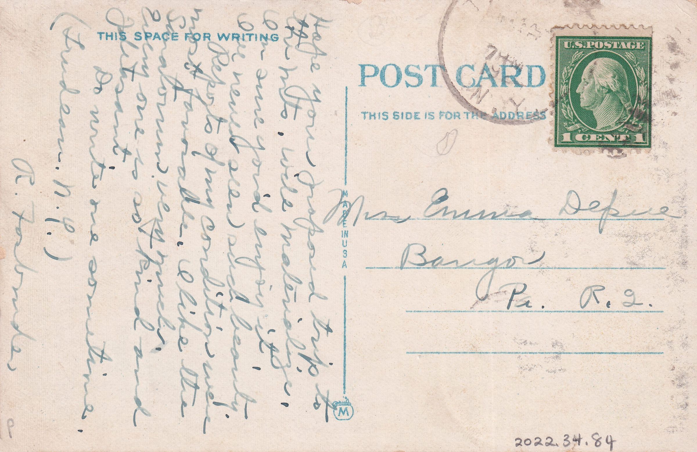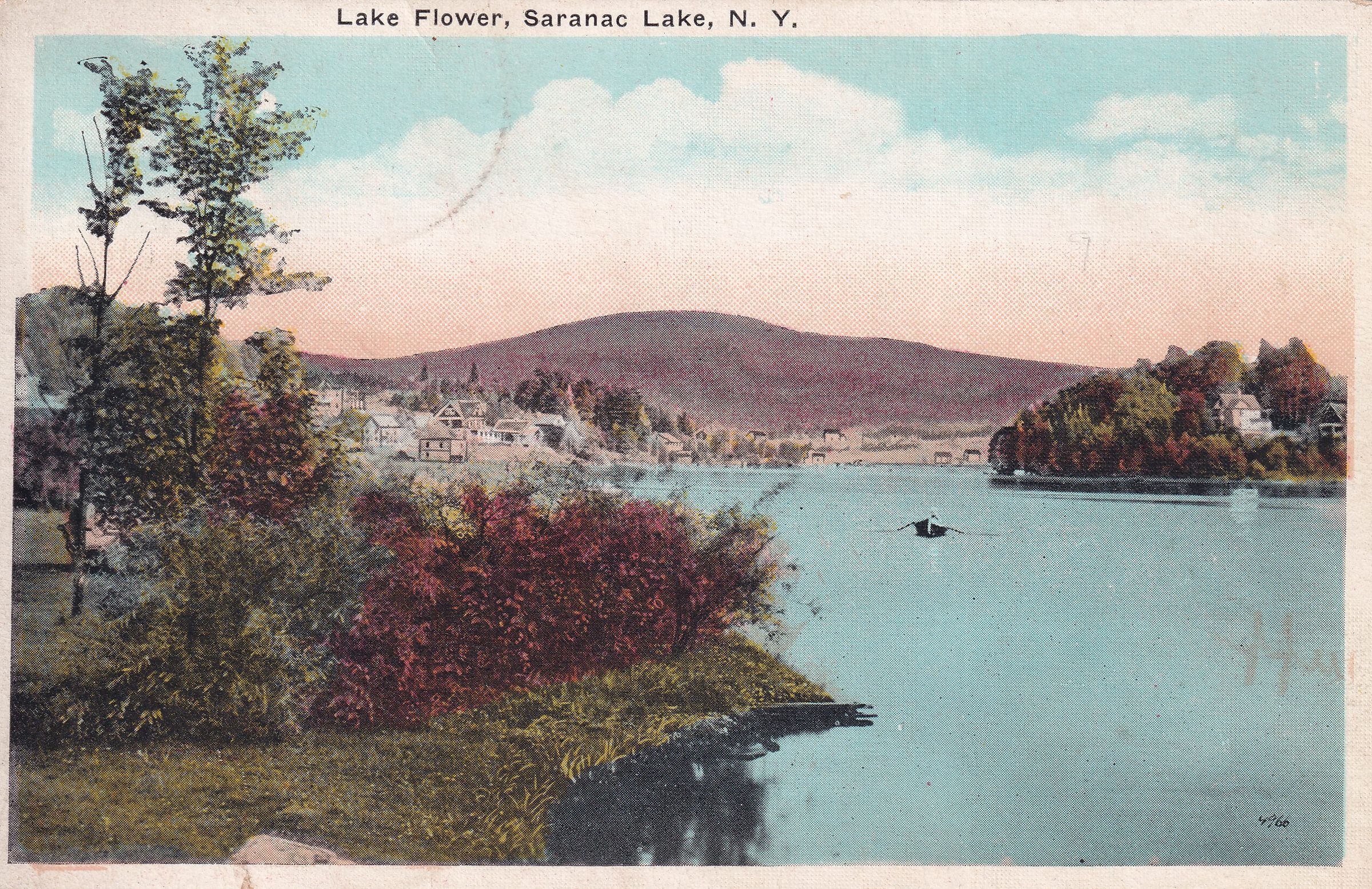 Color postcard showing a view of Saranac Lake looking south across Lake Flower. Printed caption on front reads, "Lake Flower, Saranac Lake, N. Y." No printer's mark. Used, divided back, white border, postmark illegible. Handwritten message on back reads, "Hope your proposed trip to the mts. will materialize. I'm sure you'd enjoy it. I've never seen such beauty. Reports of my condition were most favorable. I like the Sanatorium very much. Everyone is so kind and pleasant. Do write me sometime. (Trudeau, N.Y.). R. [Forbunde?]. Mailed to Mrs. [Emmia?] Depue. Bangor. Pa. R.I.Subject Place