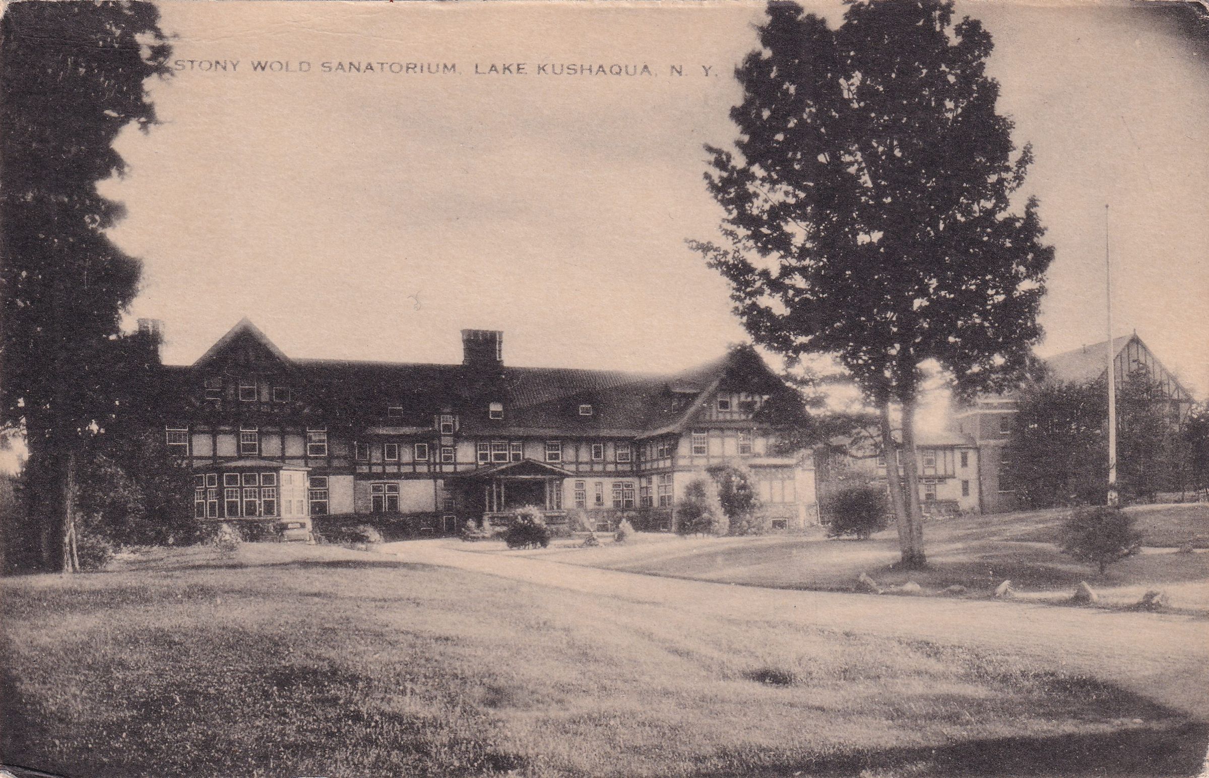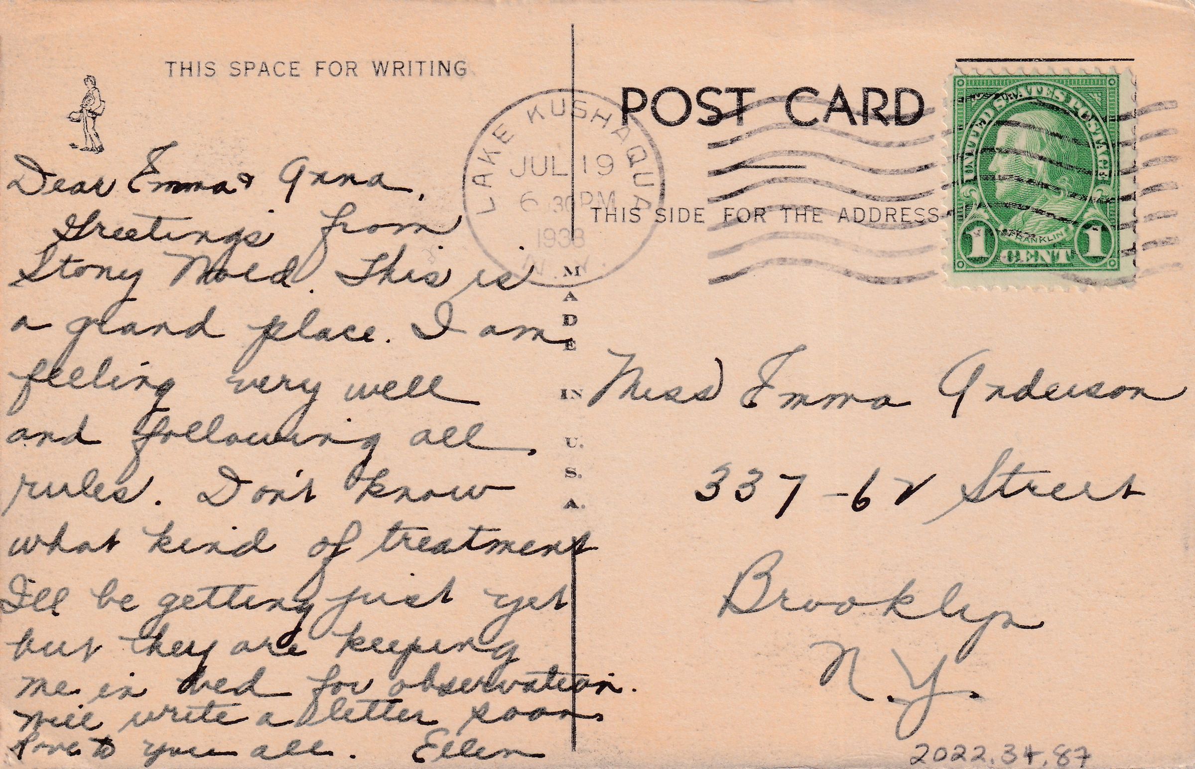 Black and white postcard showing the main building at Stony Wold Sanatorium. Printed caption on front reads, "Stony Wold Sanatorium, Lake Kushaqua, N. Y." No printer's mark. Used, divided back, postmarked Lake Kushaqua, NY, July 19, 1938. Handwritten message on back reads, "Dear Emma and Anna, Greetings from Stony Wold. This is a grand place. I am feeling very well and following all rules. Don't know what kind of treatment I'll be getting just yet but they are keeping me in bed for observation. Will write a letter soon. Love to you all. Ellen." Mailed to Miss Emma Anderson. 337--6 V Street. Brooklyn. N.Y.Subject Place