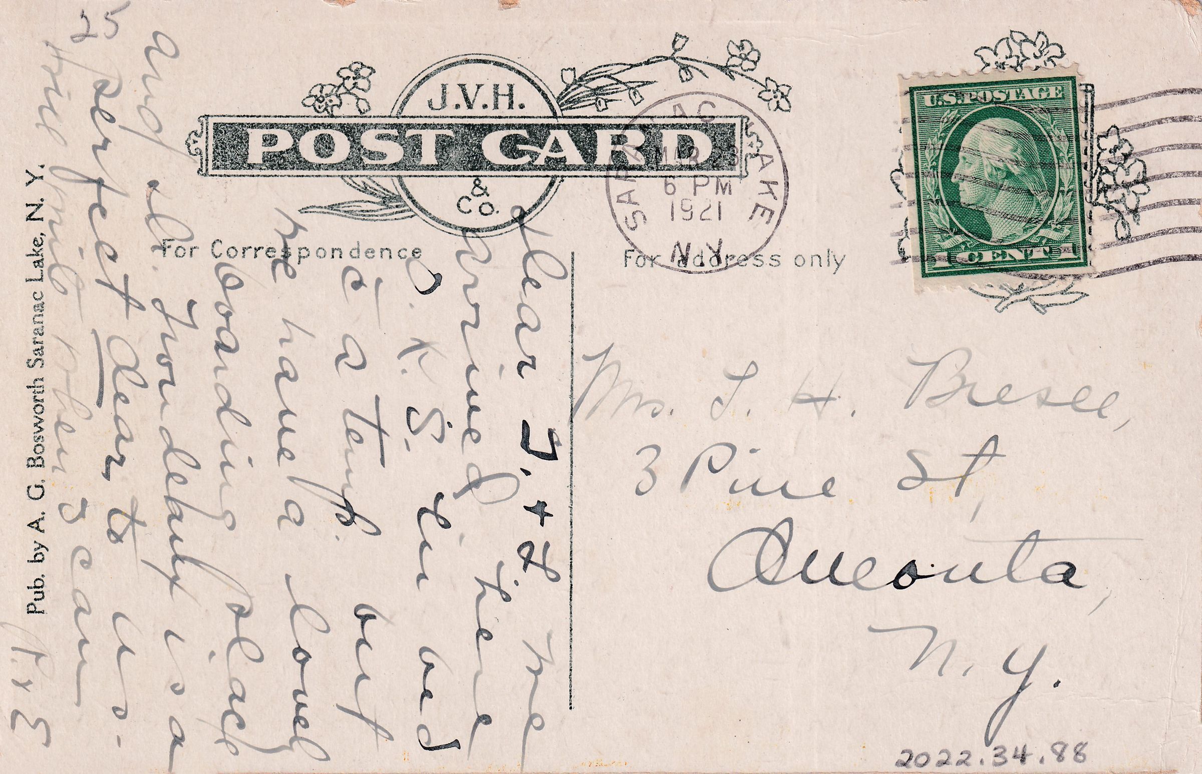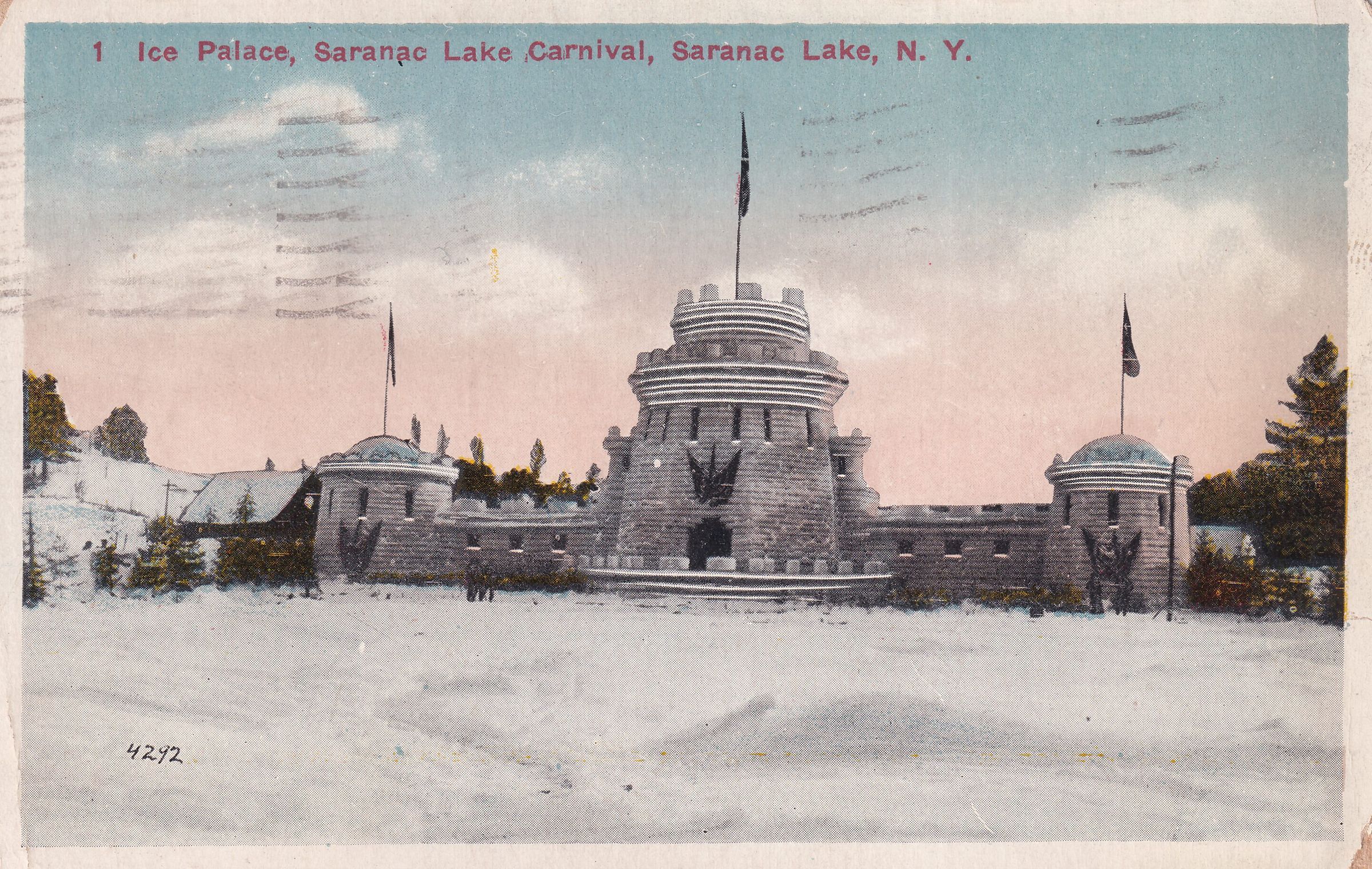 Color postcard showing an Ice Palace [possibly 1915]. Printed caption on front reads, "Ice Palace, Saranac Lake Carnival, Saranac Lake, N. Y." Printed by A. G. Bosworth, Saranac Lake. Used, divided back, white border, postmarked Saranac Lake, March 23, 1921. Handwritten message on back reads, "Dear T. and L. We arrived here D.R. S. in bed with a temp but we have a lovely boarding place and Dr Troudeaux [sic] is a perfect dear [underlined] to us. Will write when I can. P. + E." Mailed to Mrs. L. H. Bresee, 3 Pine St. Oneonta, N.Y.Subject Person/Organization