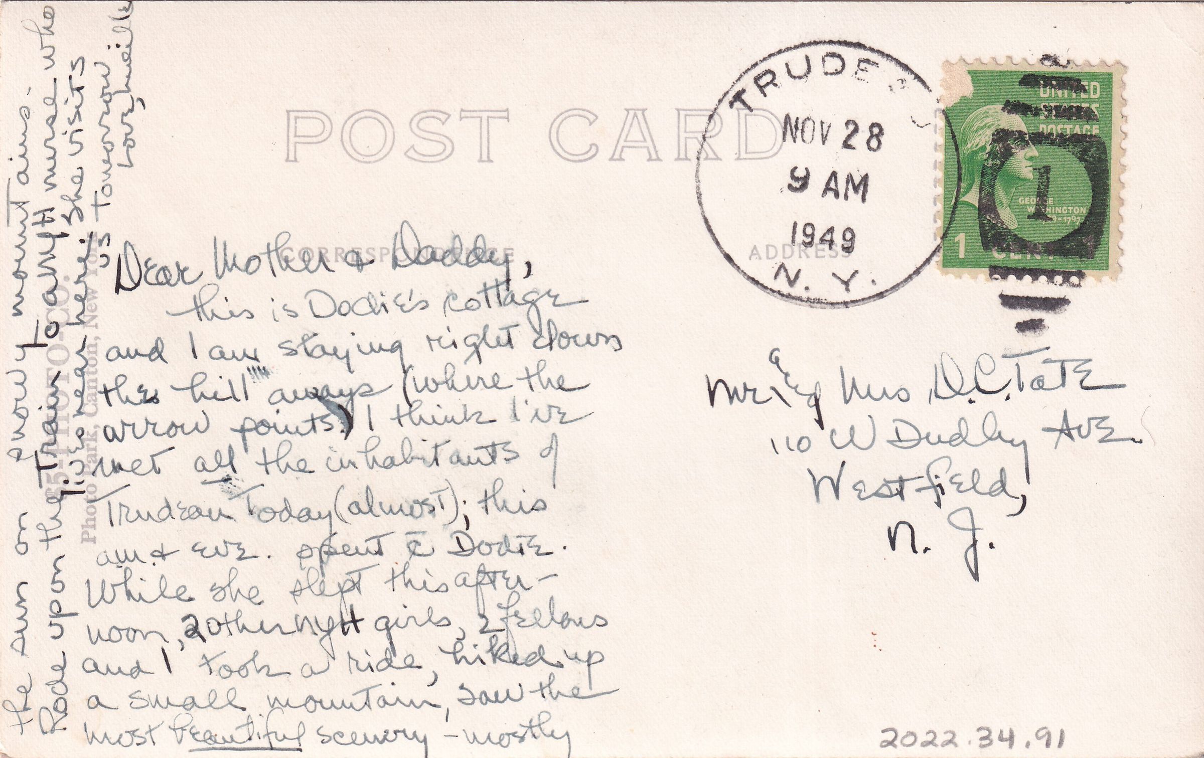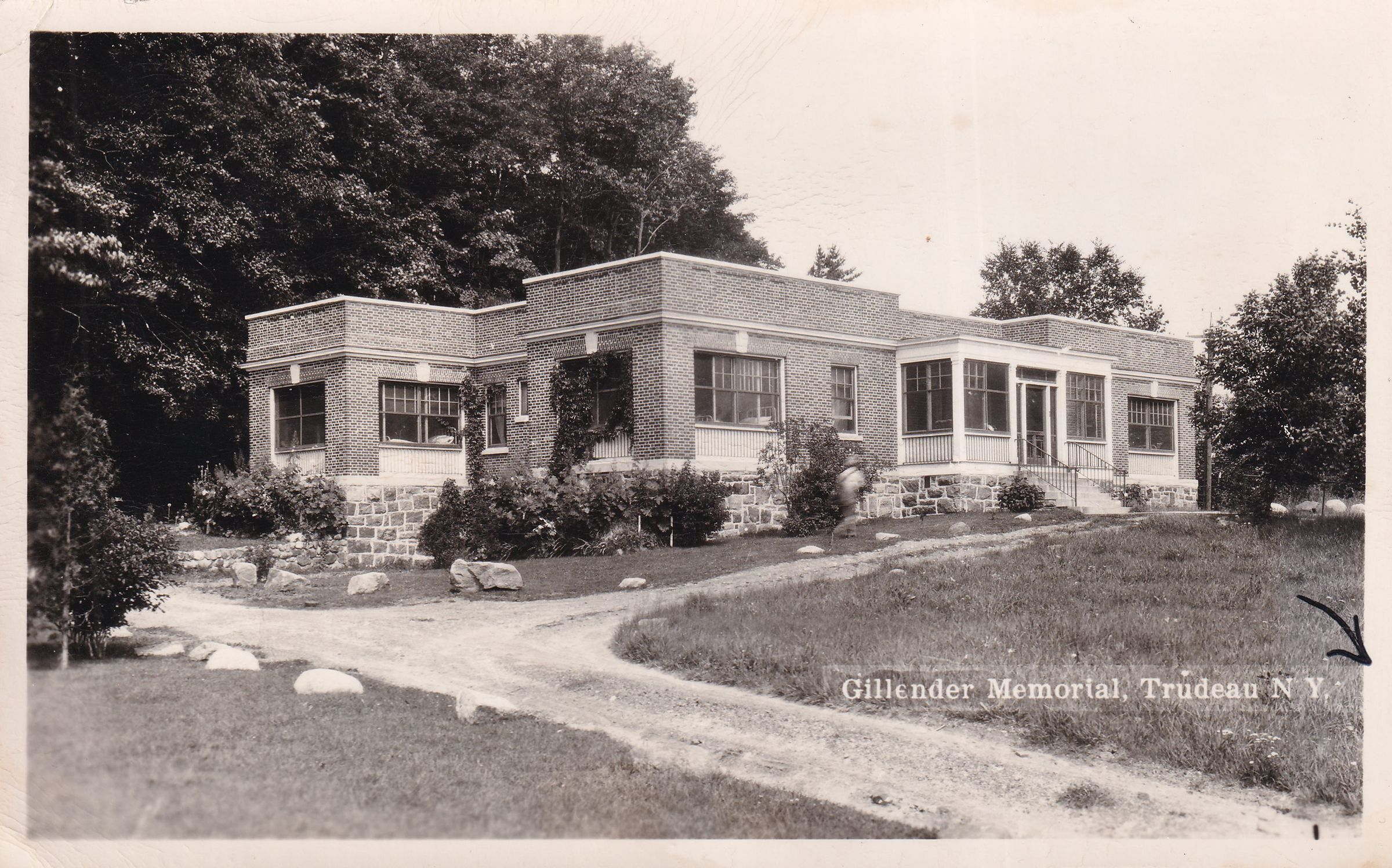 Photograph postcard showing the Gillender Memorial building at Trudeau Sanatorium. An arrow has been drawn in black in along the right bottom edge. Printed caption on front reads, "Gillender Memorial, Trudeau, N. Y." Used, divided back, white border, postmarked Trudeau, NY, November 28, 1949. Handwritten message on back reads, "Dear Mother + Daddy, This is Dodie's cottage and I am staying right down the hill aways (where the arrow points). I think I've met all [underlined] the inhabitants of Trudeau today (almost); this am + eve spent with Dodie. While she slept this afternoon, 2 other NYH girls, 2 fellows and I took a ride, hiked up a small mountain, saw the most beautiful [underlined] scenery--mostly the sun on snowy mountains. Rode up on the train to a NYH nurse who lives near here. She visits tomorrow. Love, Lucille." Mailed to Mr. and Mrs. D.C. Tate. 110 W. Dudley Ave. Westfield. N.J.Subject Place