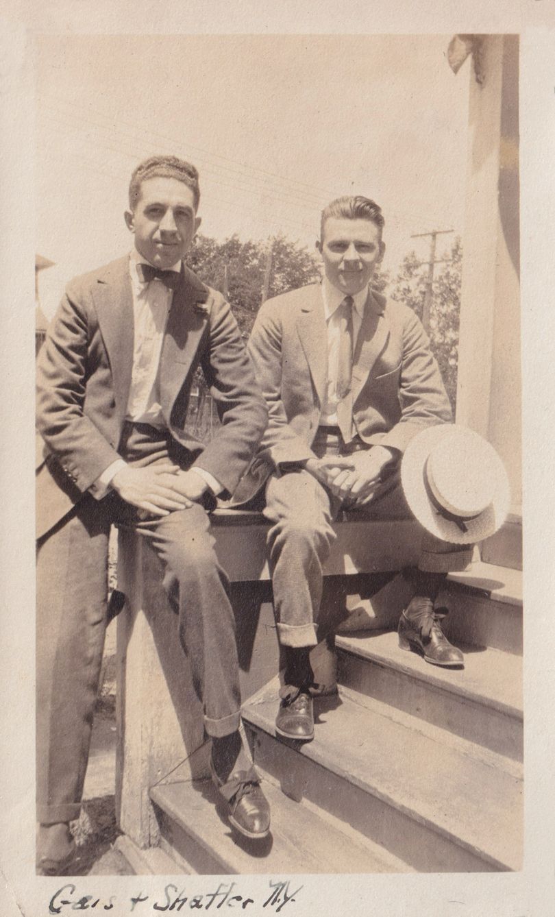 Black-and-white photograph of two men sitting on the fence next to a set of stairs leading up to a cure cottage porch. "Gais + Shaffer N.Y." is written in ink at the bottom of the photograph.