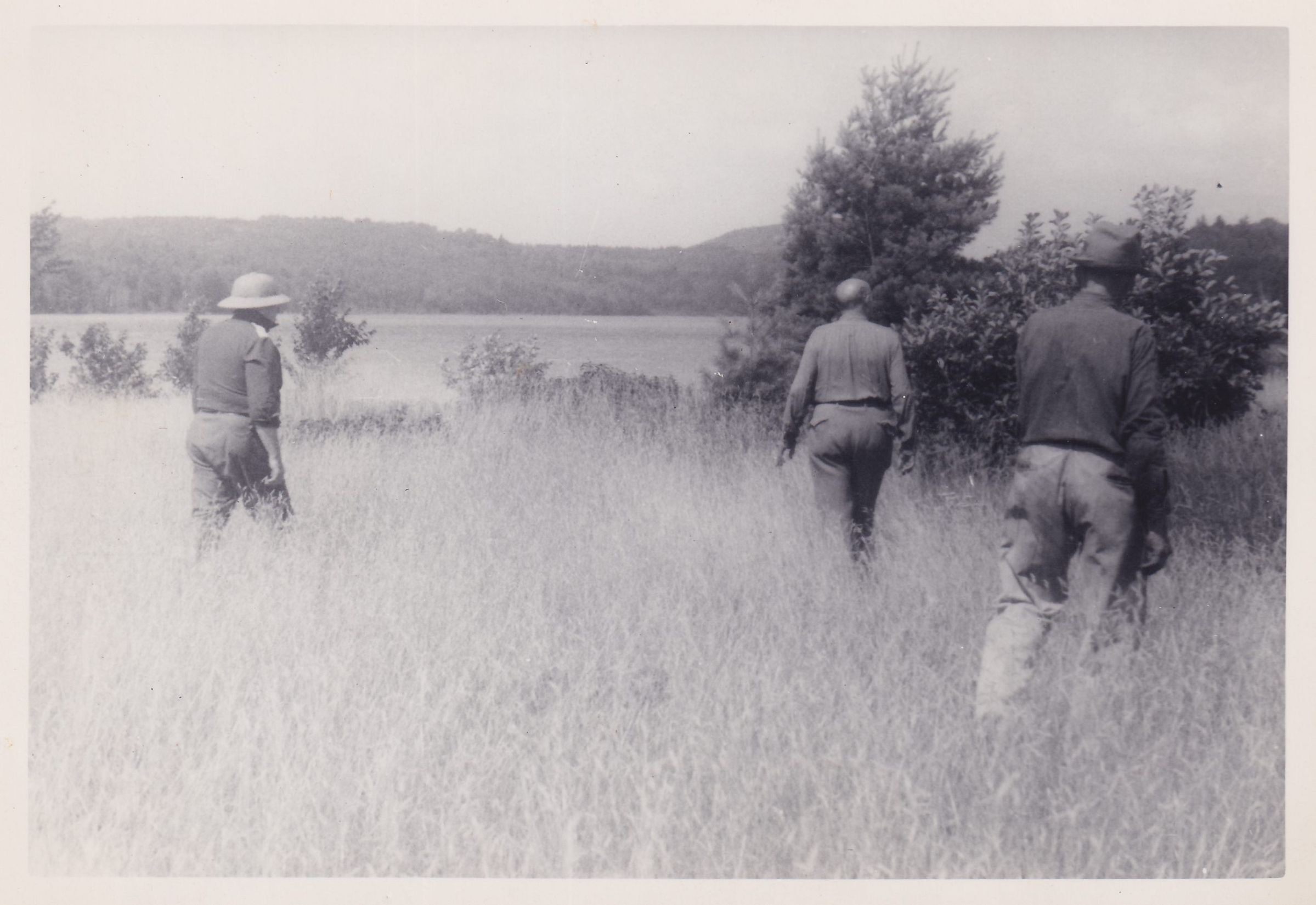 Black-and-White photograph of three men walking through a field. Their backs are to the camera.