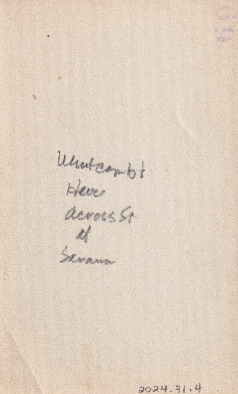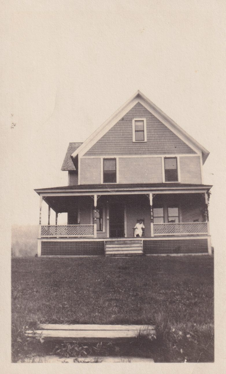 Black-and-White photograph of a house with a large wrap-around porch. The photograph was taken from down the hill, and a woman can be seen sitting on a rocking chair on the porch. Handwritten caption on reverse reads, "Whitcomb's [this is not correct, it is noted as Whitman on other images] house across st. at Saranac."