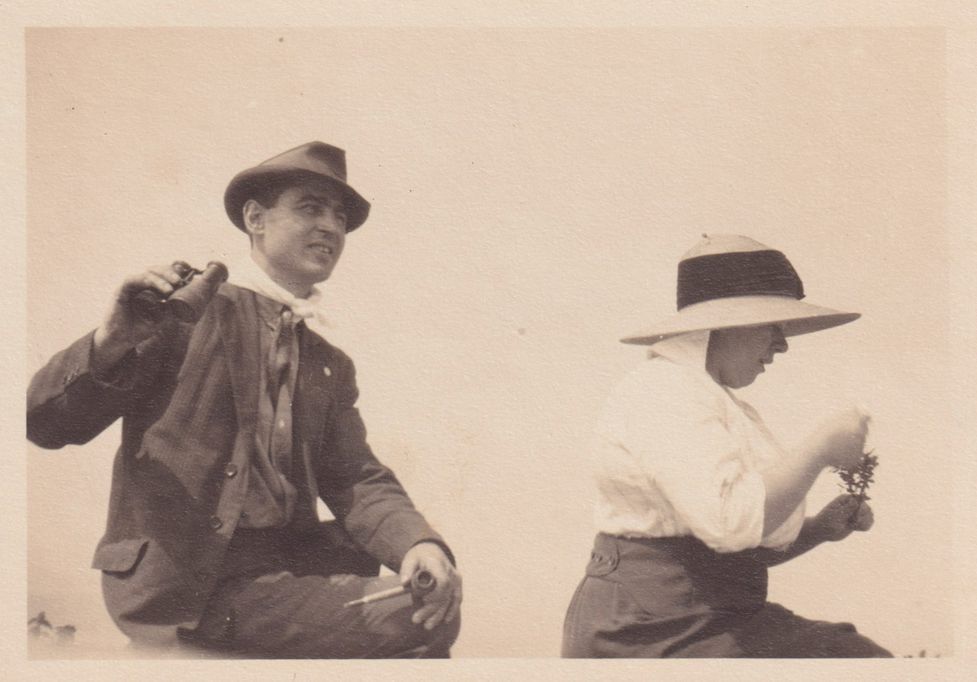 Black-and-White photograph of an unidentified man and woman seated outdoors. He is holding a pair of binoculars and she has a flower in her hand. The photograph was likely printed by Kollecker's Kodak and Gift Shop.