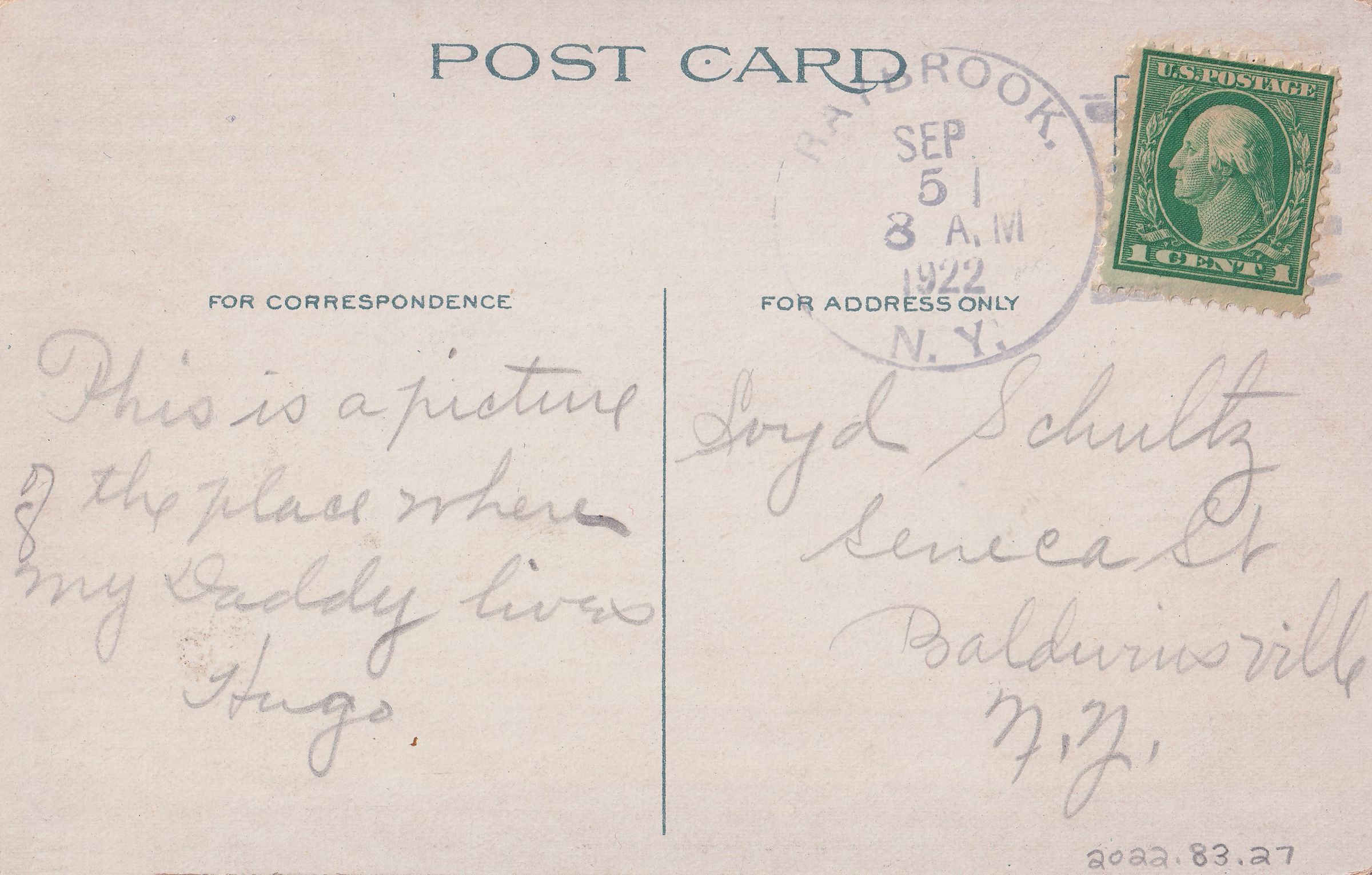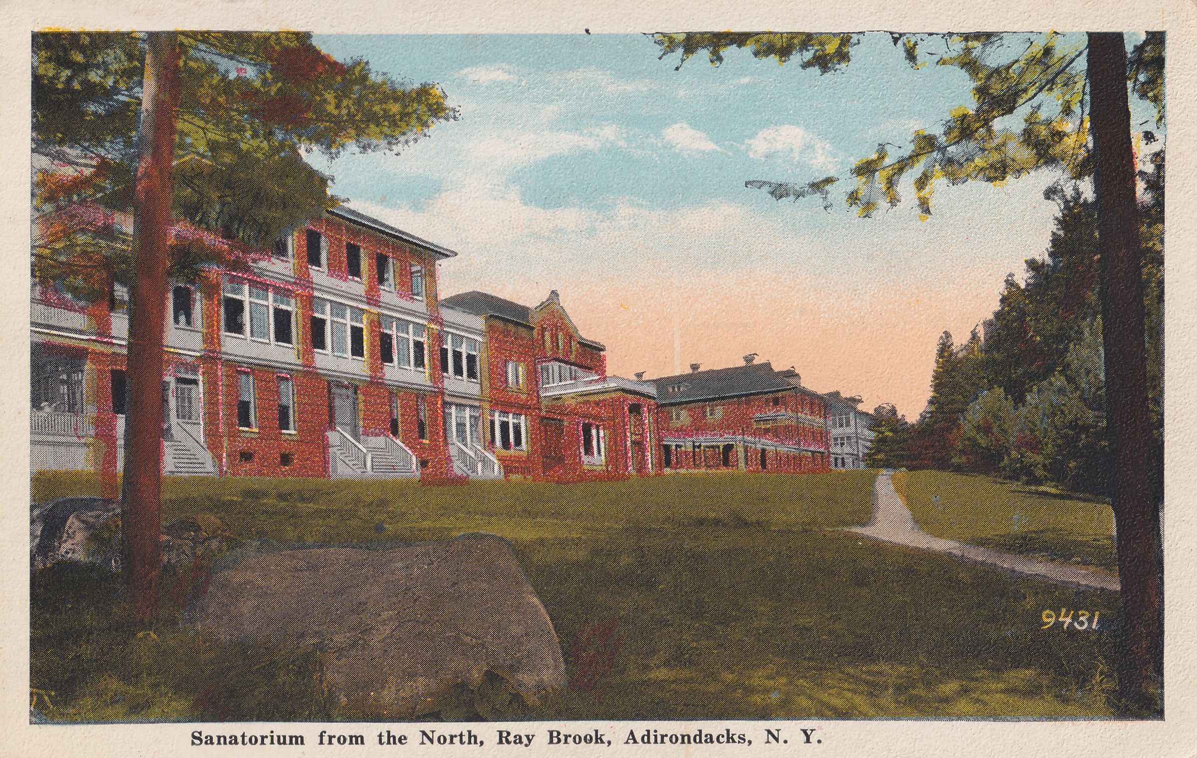 Color postcard showing the main building at the New York State Hospital for Incipient Tuberculosis, AKA Ray Brook Sanatorium. Printed caption on front reads, "Sanatorium from the North, Ray Brooks, Adirondacks, N. Y." No printer's mark. Used, divided back, white border, postmarked Ray Brook, NY, September 5, 1922. Handwritten message on back reads, "This is a picture of the place where my Daddy lives. Hugs." Mailed to Loyd Schultz, Seneca St., Baldwinsville, N.Y.Subject Place