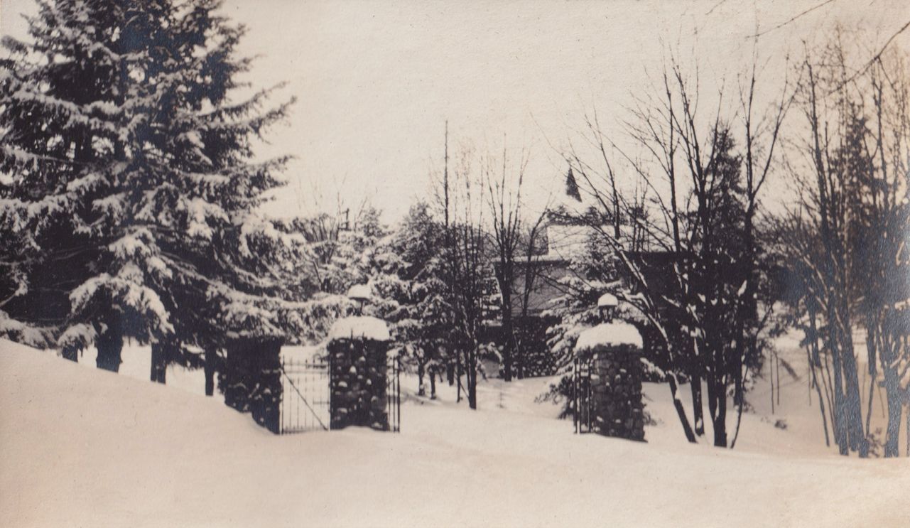 Black-and-white photograph of the gate to Trudeau Sanatorium, covered in snow. There are trees around the gate and a building visible in the background.