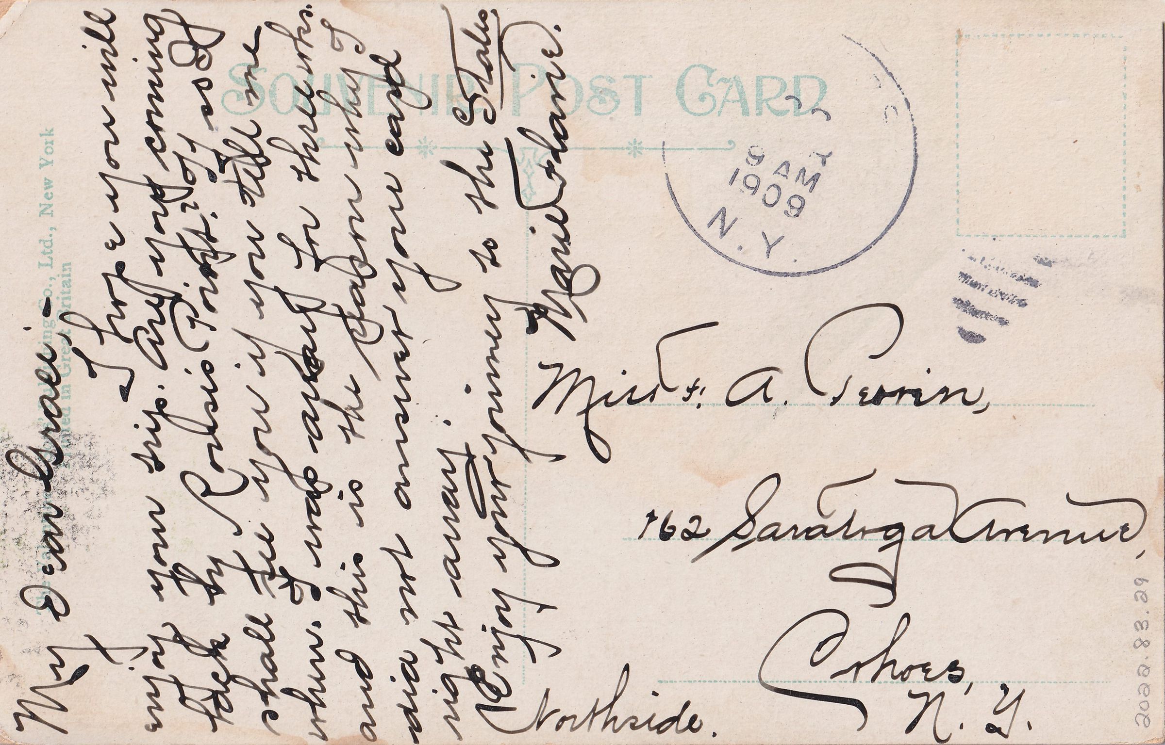 Color postcard showing the view across the front terrace of the main building at the New York State Hospital for Incipient Tuberculosis, AKA Ray Brook Sanatorium. Printed caption on front reads, "N.Y. State Sanatorium, Ray Brook, N.Y." Printed by the Valentine & Sons' Publishing Co., Ltd., New York. Used, divided back, postmarked 1909 [rest illegible]. Handwritten message on back reads, "My Dear Grace-- I hope you will enjoy your trip. Are you coming back by Rouse's Point. If so I shall see you if you tell me when I was away for three wks. did not answer your card right away. Enjoy your journey to the States. Marie Flavie." Mailed to Miss G.A. Perrin, 162 Saratoga Avenue, Cohoes, Northside, N.Y.Subject Place