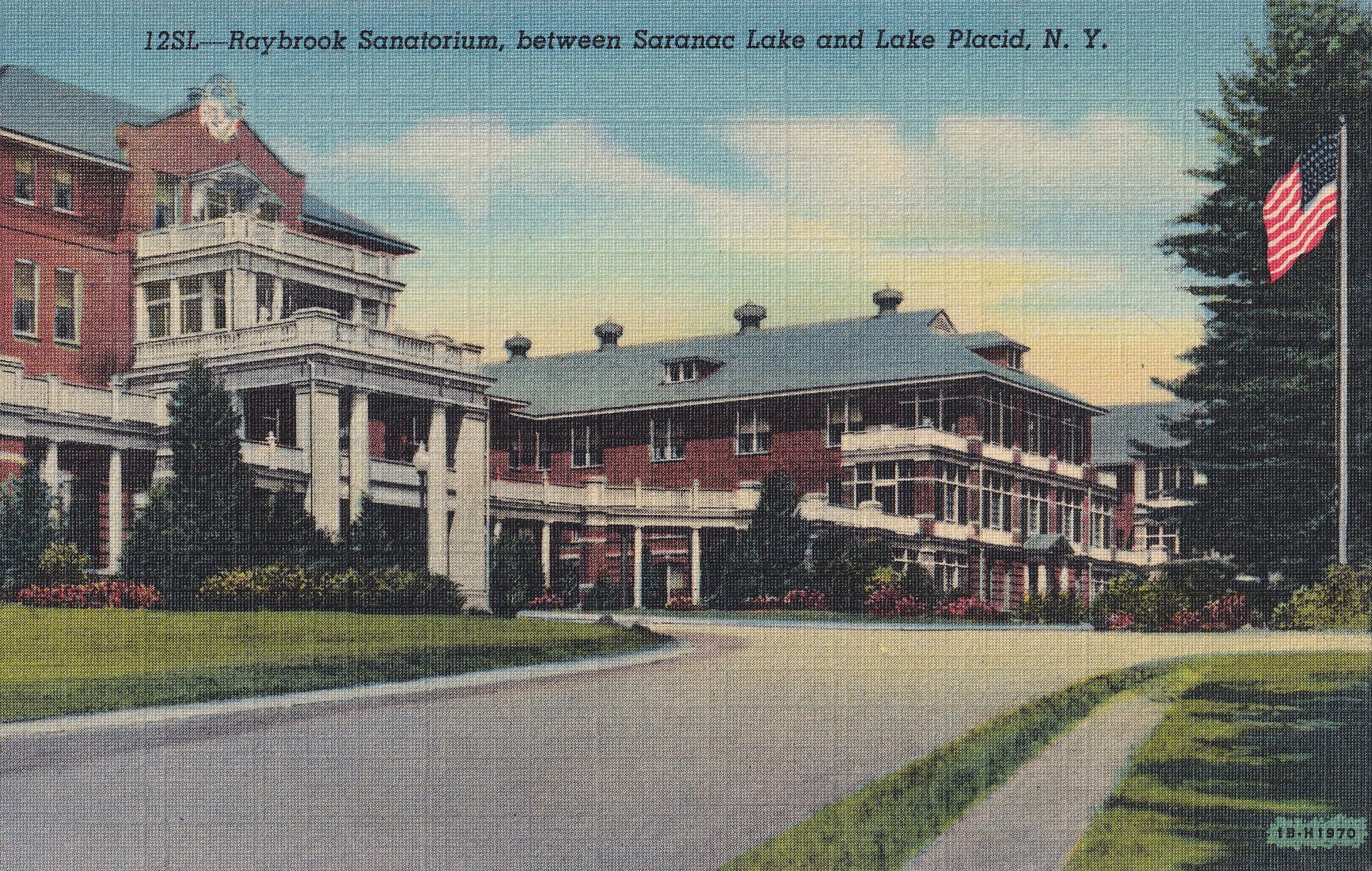 Color postcard showing the main building at the New York State Hospital for Incipient Tuberculosis, AKA Ray Brook Sanatorium. Printed caption on front reads, "Raybrook Sanatorium, between Saranac Lake and Lake Placid, N.Y." Printed by C. W. Hughes & Co., Mechanicville, NY. Unused, divided back, linen.Subject Place