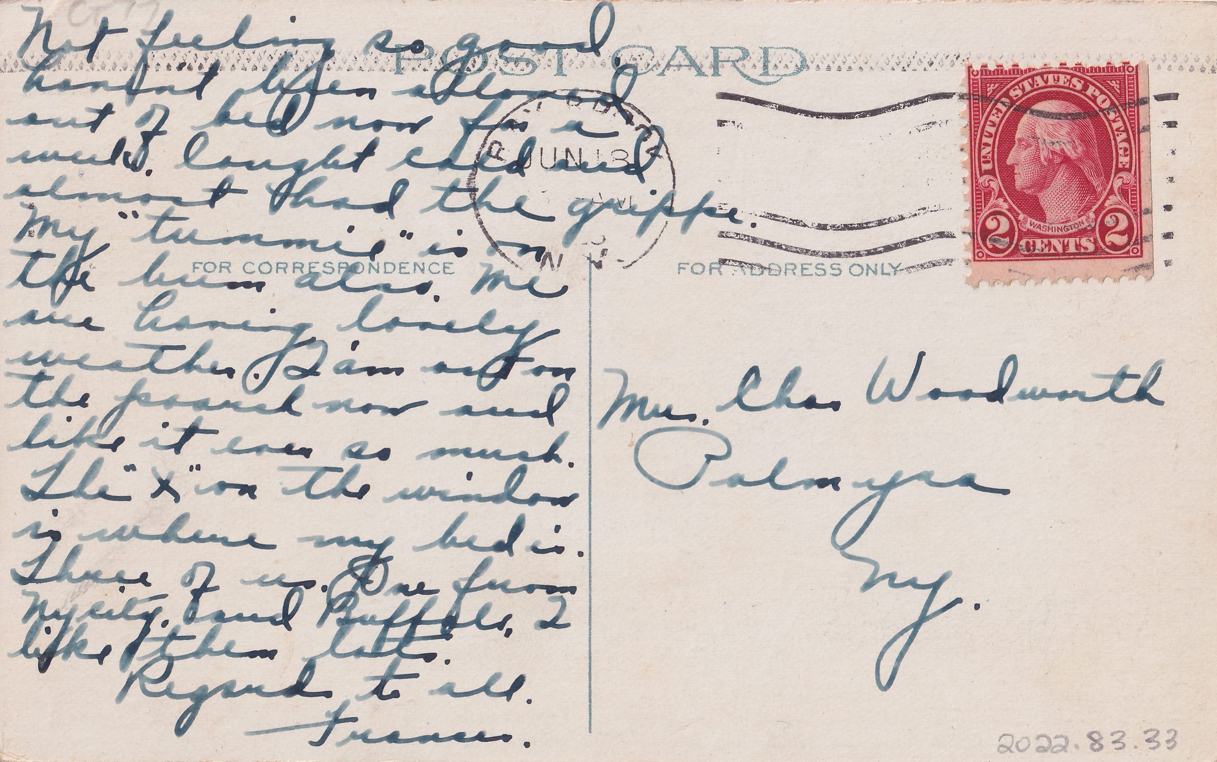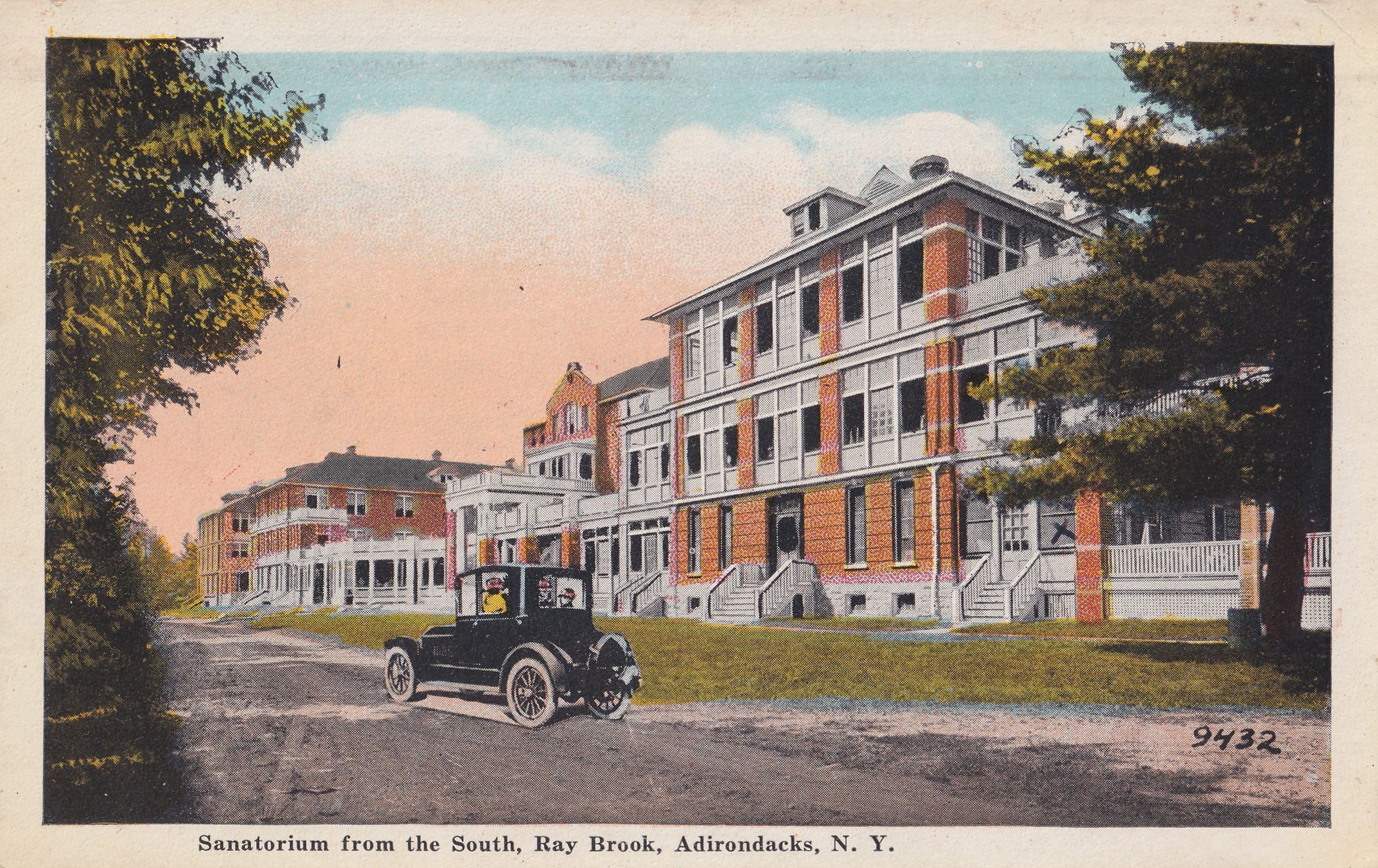 Color postcard showing the main building at the New York State Hospital for Incipient Tuberculosis, AKA Ray Brook Sanatorium with a 1920s-style car in front. There is a small "x" in black ink over one first floor window. Printed caption on front reads, "Sanatorium from the South, Ray Brook, Adirondacks, N.Y." No printer's mark. Used, divided back, white border, postmarked Ray Brook, NY, June 13, [?]. Handwritten message on back reads, “Not feeling so good, haven't been allowed out of bed now for a week. Caught cold and almost had the grippe. My "tummie" is on the bum alas. We are having lovely weather. I am out on the poarch [sic] now and like it ever so much. The "x" in the window is where my bed is. Three of us. One from NY city and Buffalo. I like them lots. Regards to all, Frances." Mailed to Mrs. Chas Woodworth, Palmyra, NY.Subject Place