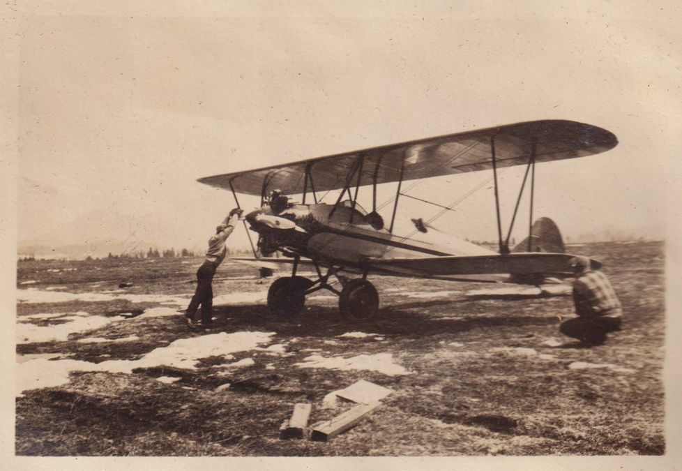 Black-and-White photograph of a biplane in a snowy field. A person is reaching up to spin the propellor while another squats near the wing.