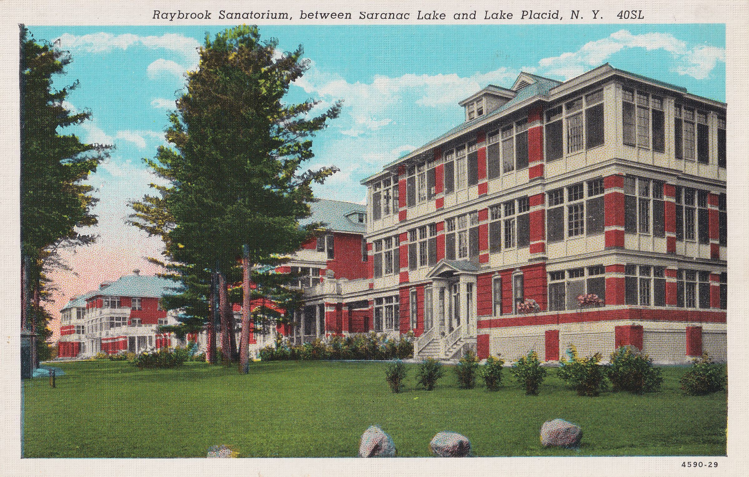 Color postcard showing the main building at the New York State Hospital for Incipient Tuberculosis, AKA Ray Brook Sanatorium. Printed caption on front reads, "Raybrook Sanatorium, between Saranac Lake and Lake Placid, N.Y." Printed by C. W. Hughes & Co., Inc., Mechanicville, NY. Unused, divided back, white border.Subject Place