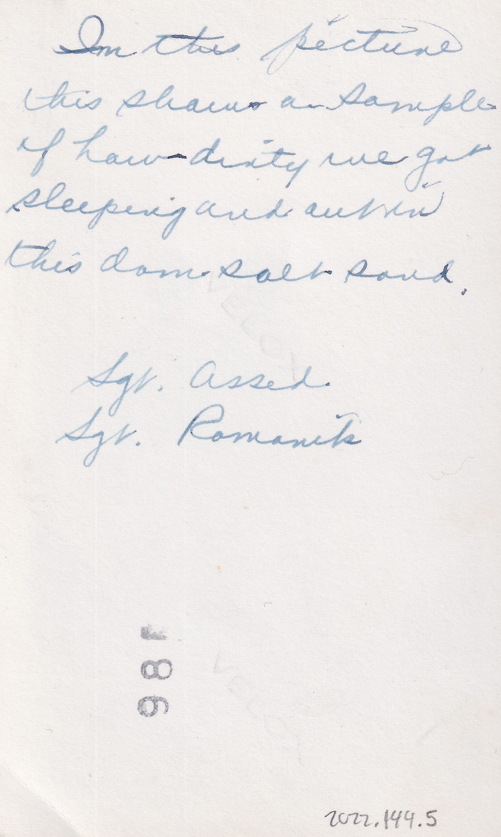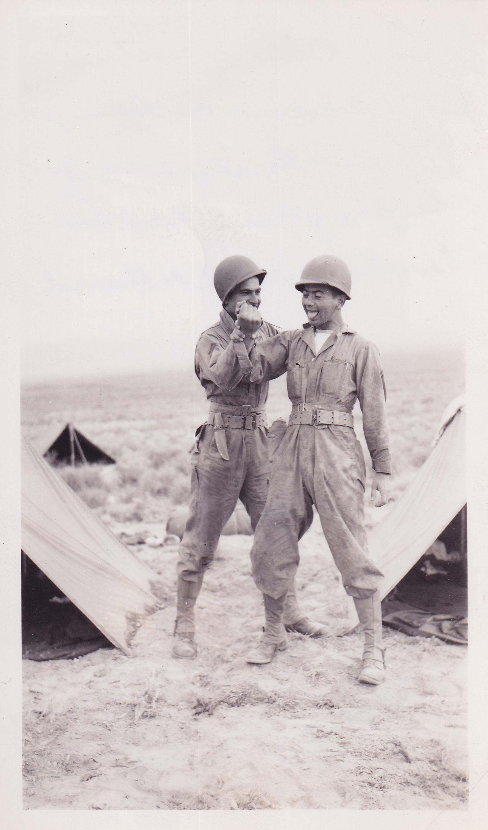 Black-and-White photograph showing two soldiers standing between canvas tents. One of them is pretending to attack the other. Handwritten caption on back reads, "In this picture this shows a sample of how dirty we got sleeping and out in this dam salt sand. Sgt. Assed, Sgt. Romanik."